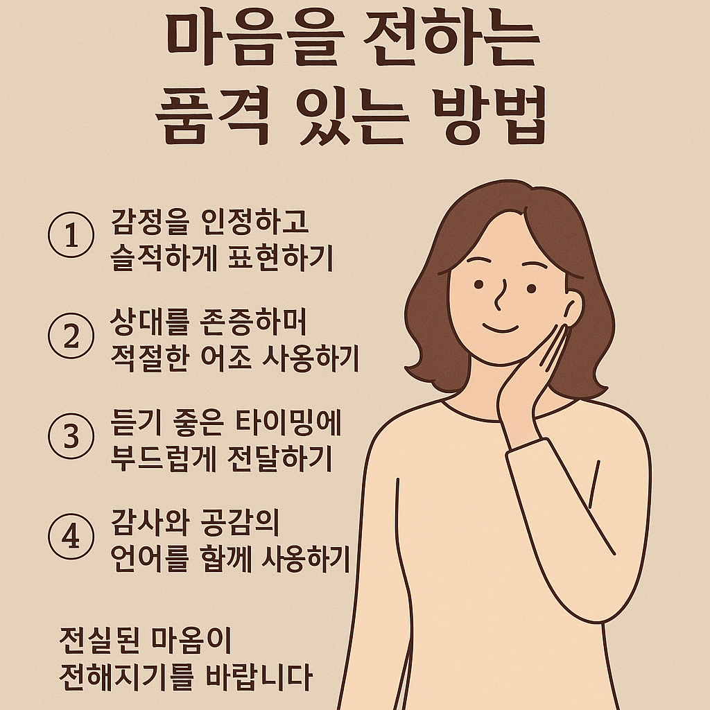 감정은 숨기는 것이 아니라, 품격 있게 전달하는 것이 중요합니다. 솔직함과 배려가 함께할 때, 감정은 오히려 관계를 단단하게 만드는 힘이 됩니다.