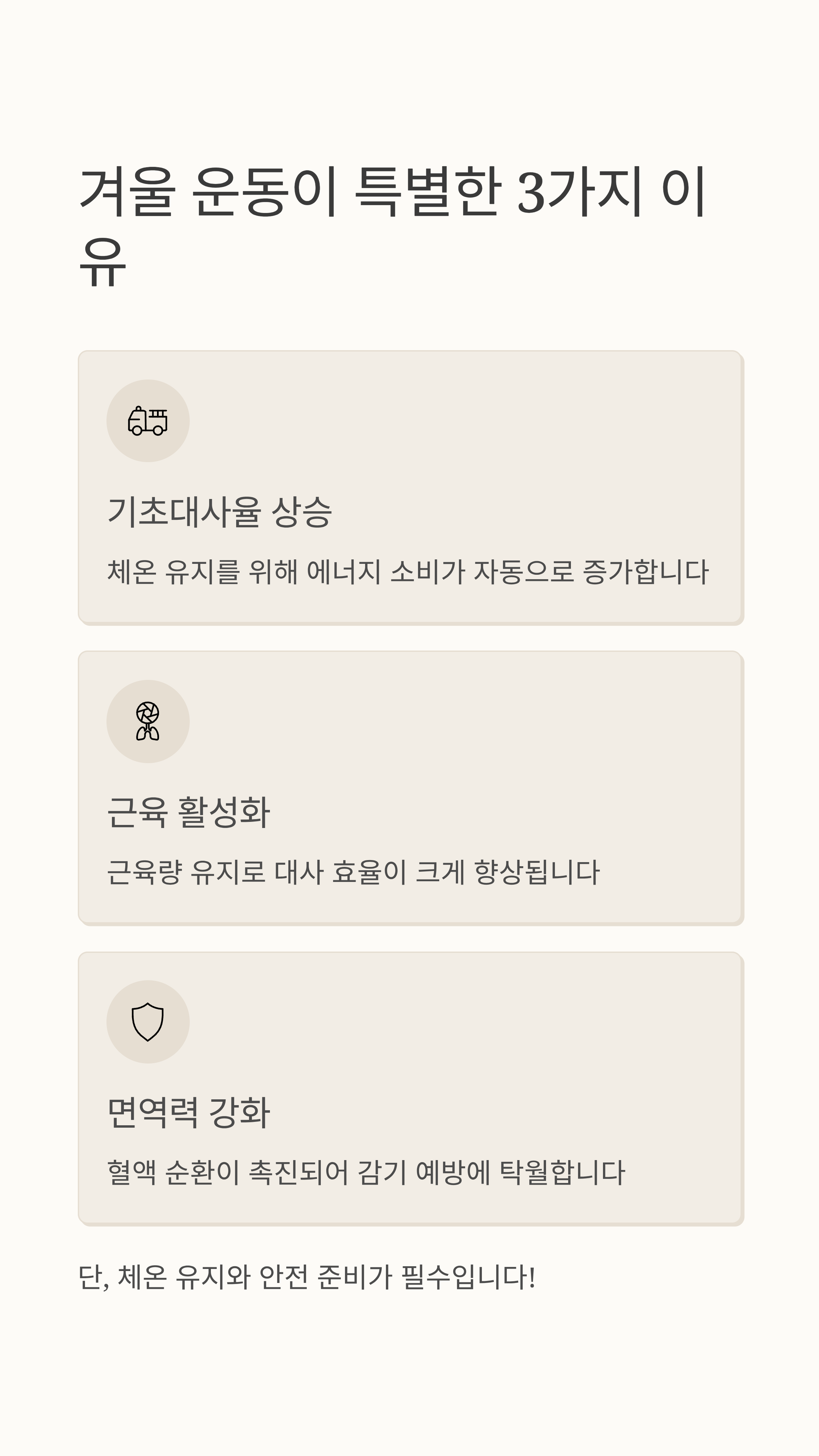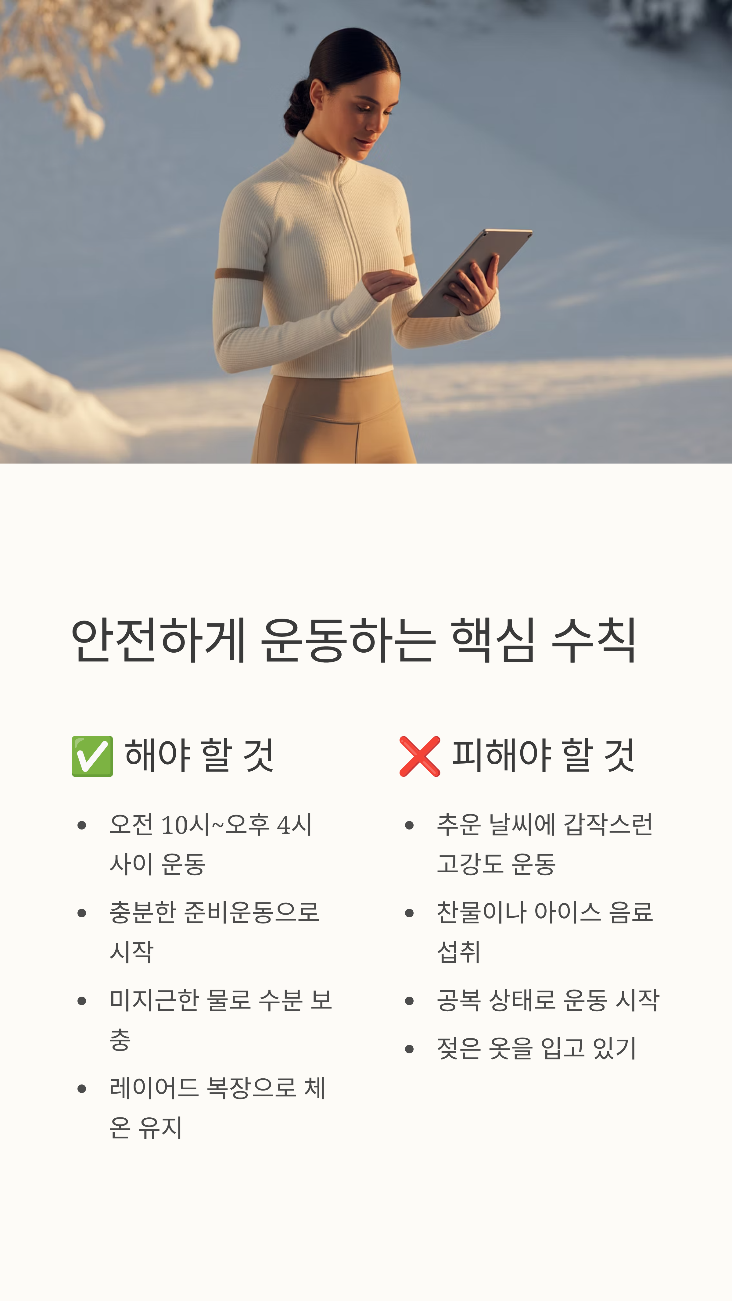- ❌ 추운 날씨에 고강도 운동 시작 금지 (근육 파열 위험)