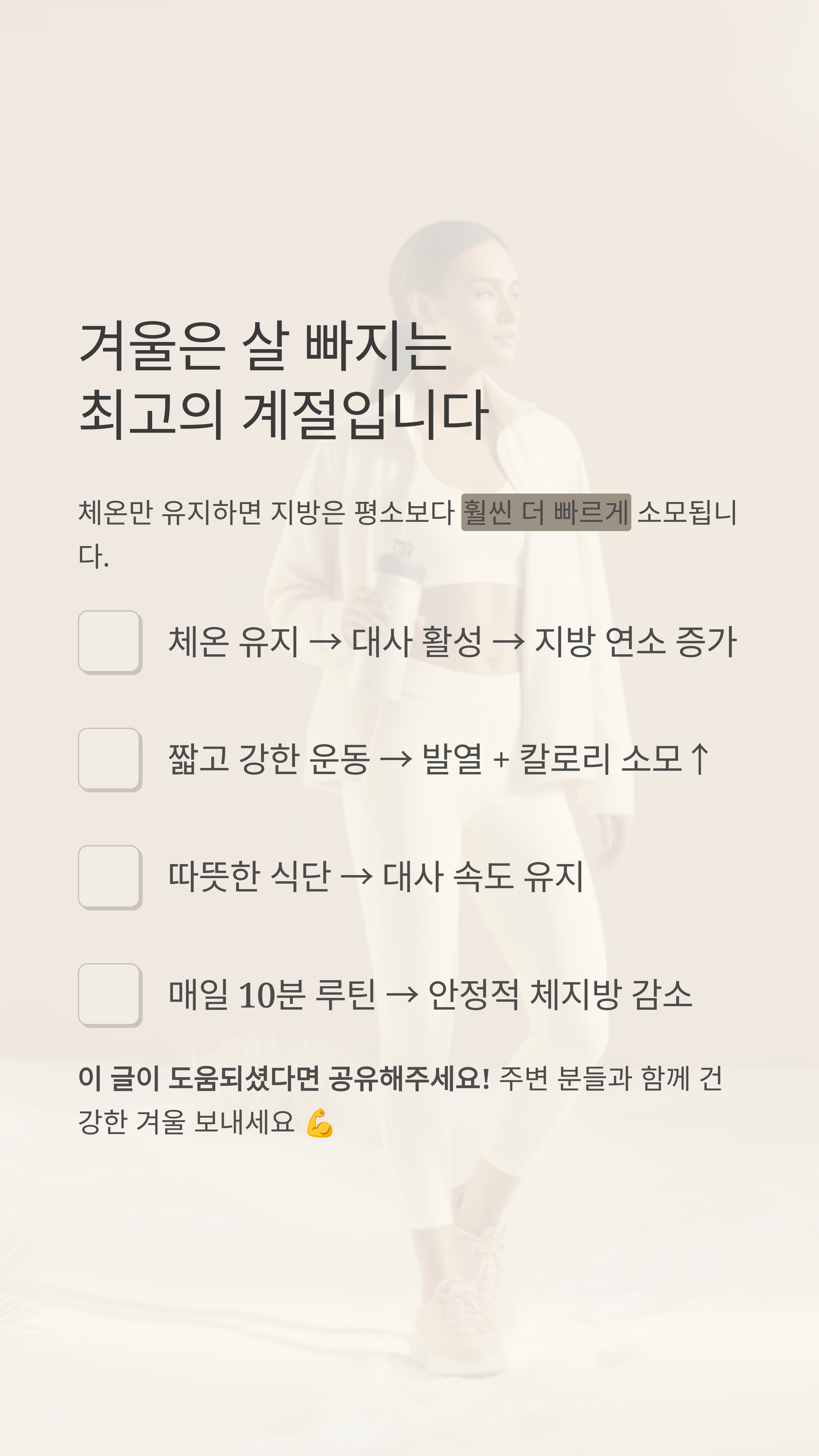즉, 겨울은 게으르면 쪄도 쉽지만, 조금만 움직이면 평소보다 훨씬 빠르게 체지방이 감소하는 시즌입니다.