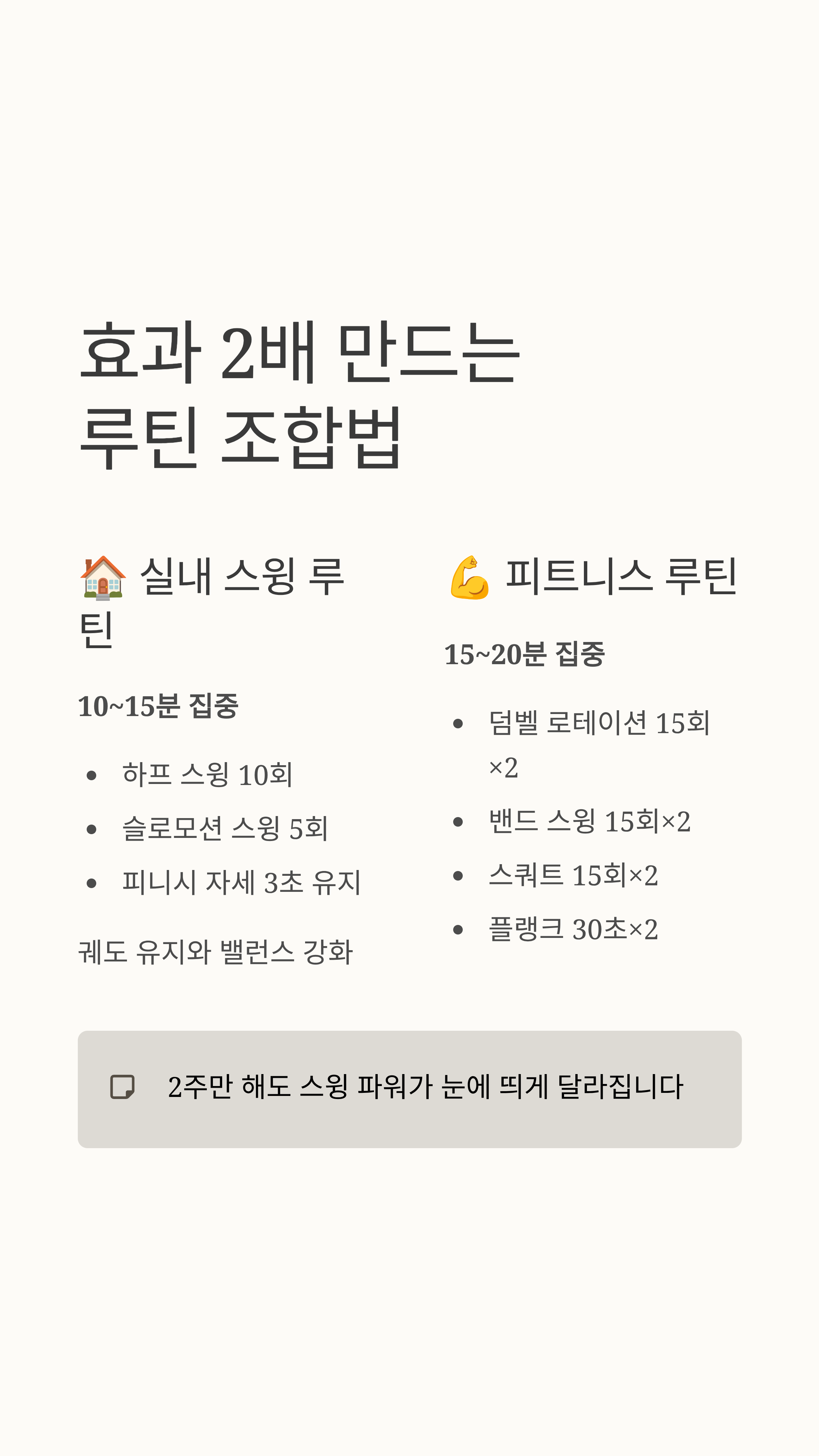 근력만 키워도 안 되고, 스윙만 반복해도 효과가 떨어집니다. 가장 좋은 방법은 다음 조합입니다.