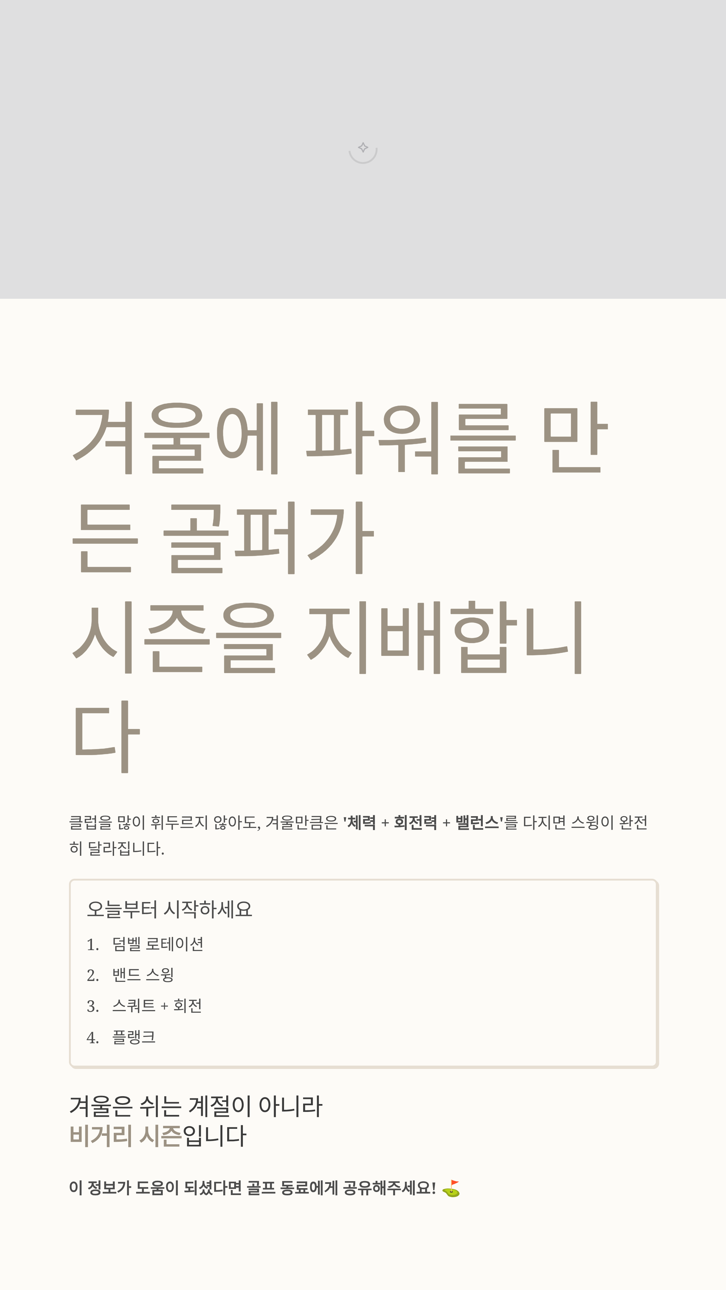 겨울을 잘 보내는 골퍼는 다음 시즌 티샷에서 즉시 차이를 만들어냅니다. 클럽을 많이 휘두르지 않아도, 겨울만큼은 ‘체력 + 회전력 + 밸런스’를 다지면 스윙이 완전히 달라집니다.
