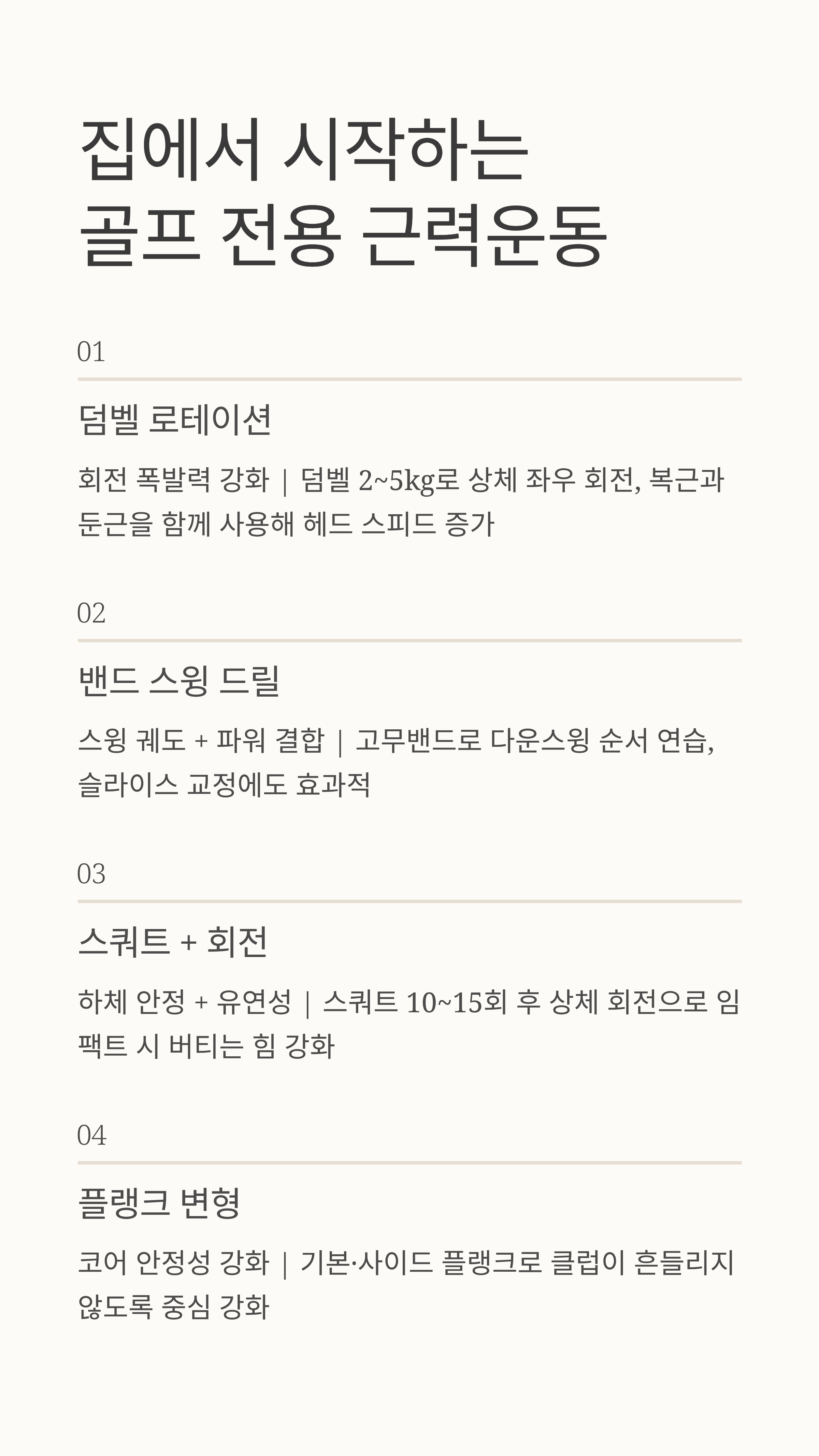 덤벨 로테이션, 밴드 스윙, 스쿼트 + 회전 스트레칭 같은 ‘골프 전용 근력운동’을