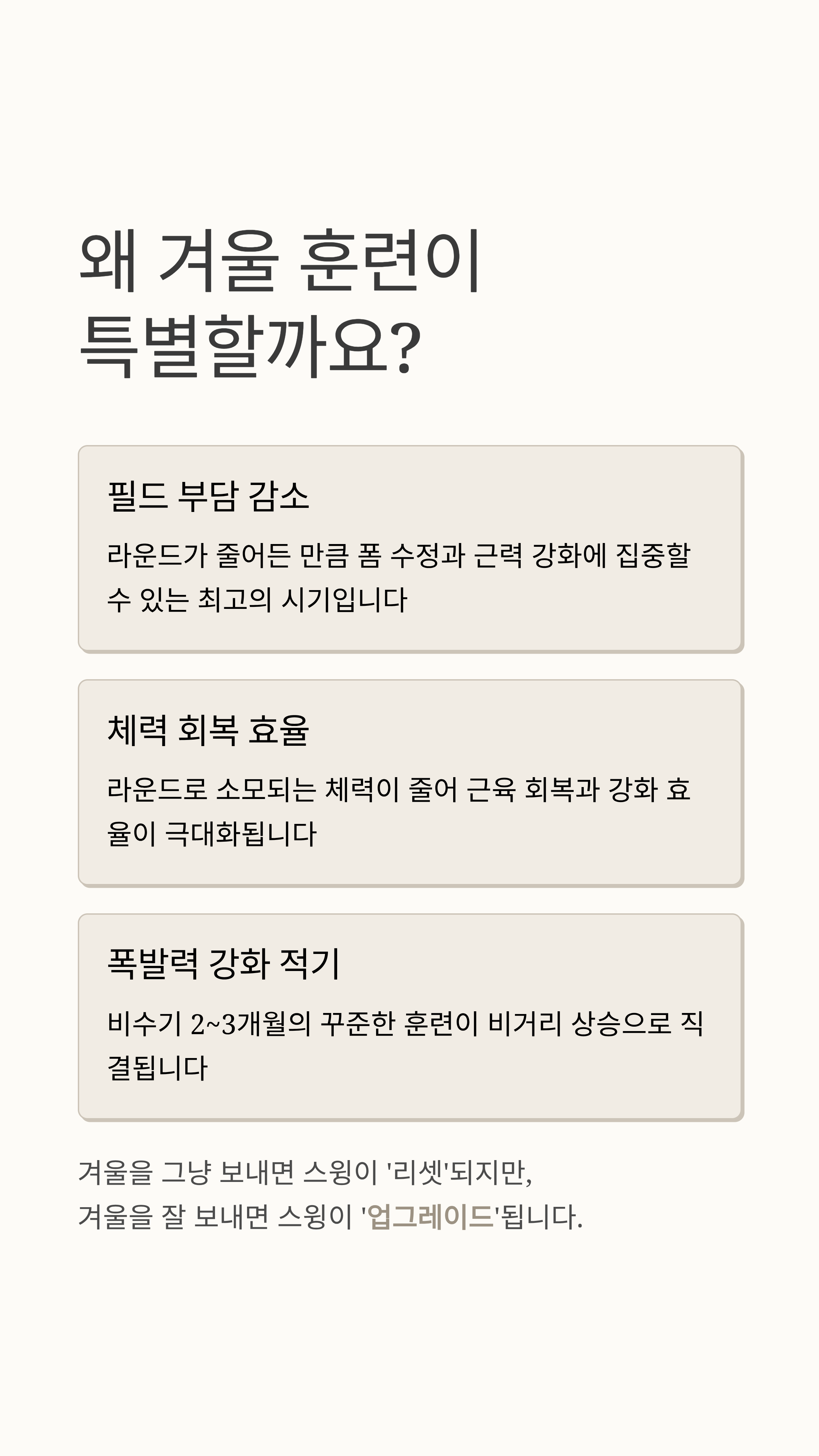 겨울을 그냥 보내면 시즌에 스윙이 ‘리셋’되지만, 겨울을 잘 보내면 시즌에 스윙이 ‘업그레이드’됩니다.
