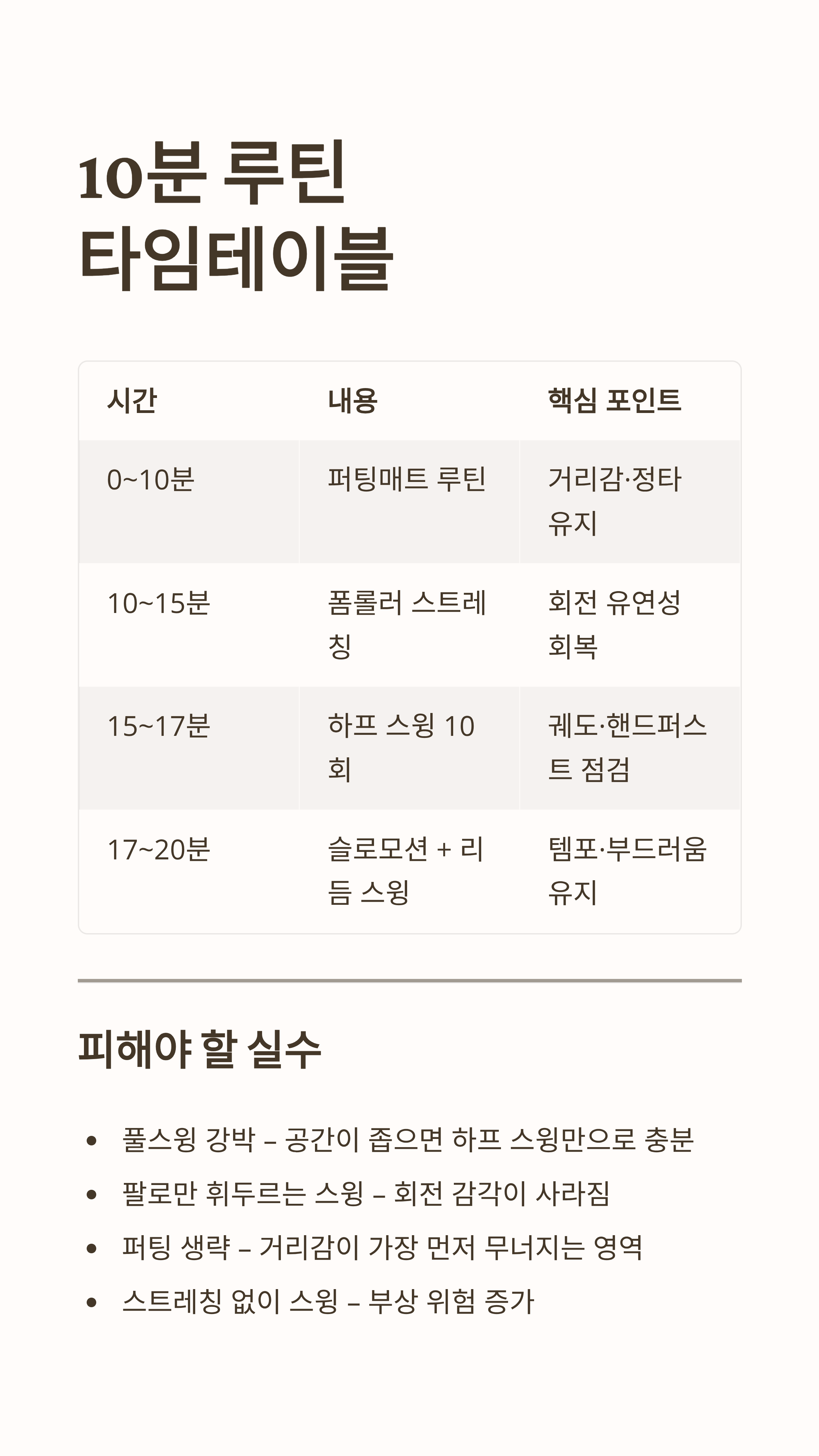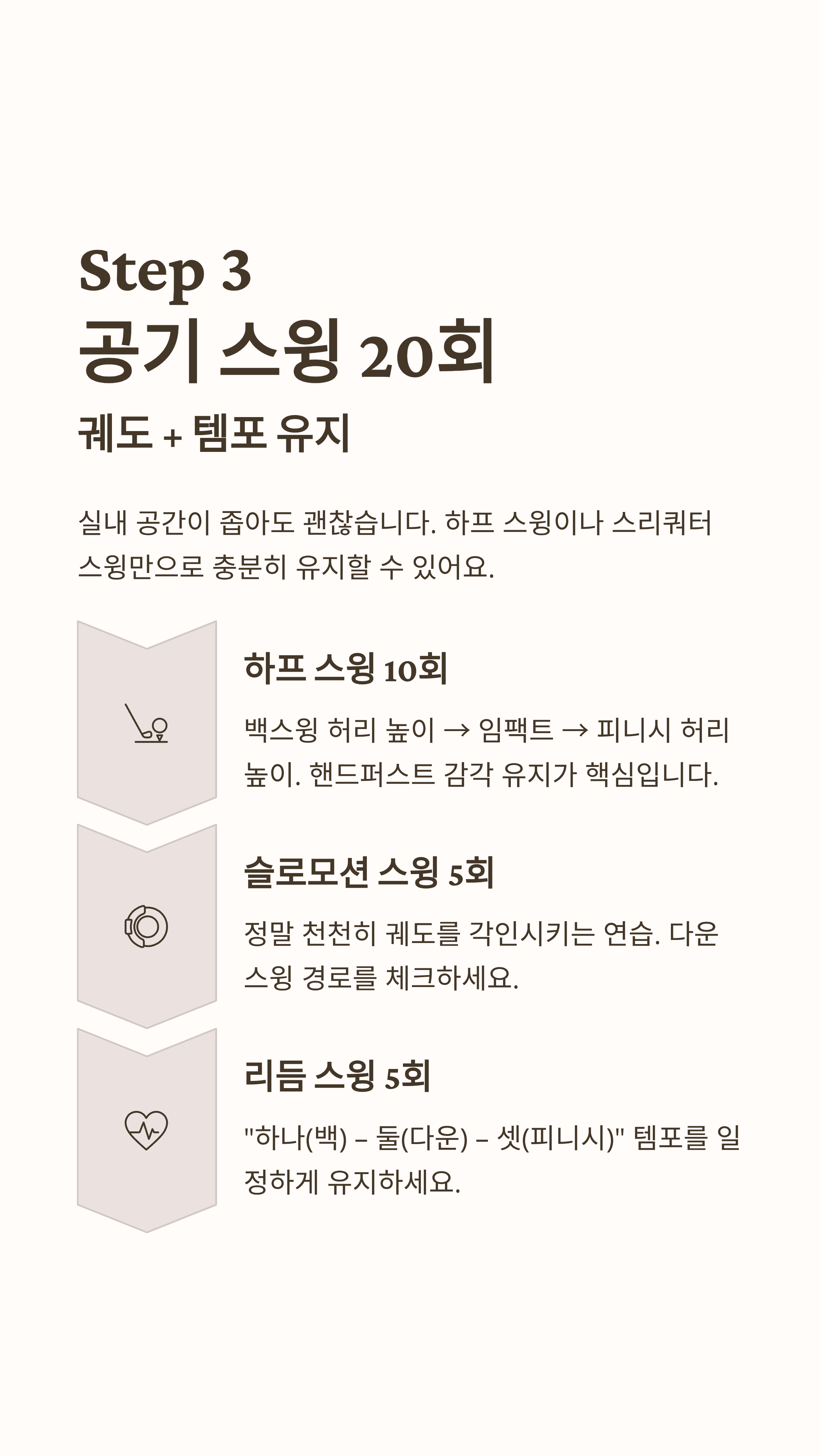 - ③ 공기 스윙 20회 – 궤도·리듬 유지