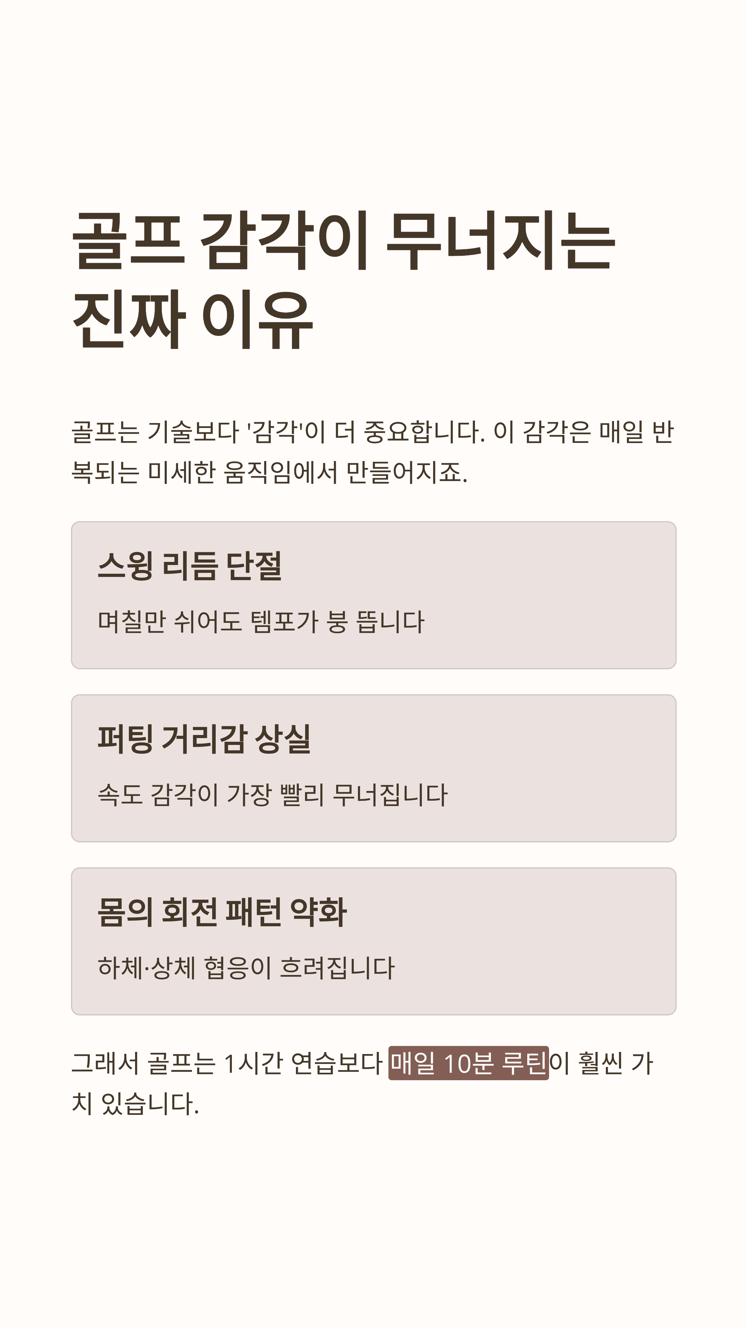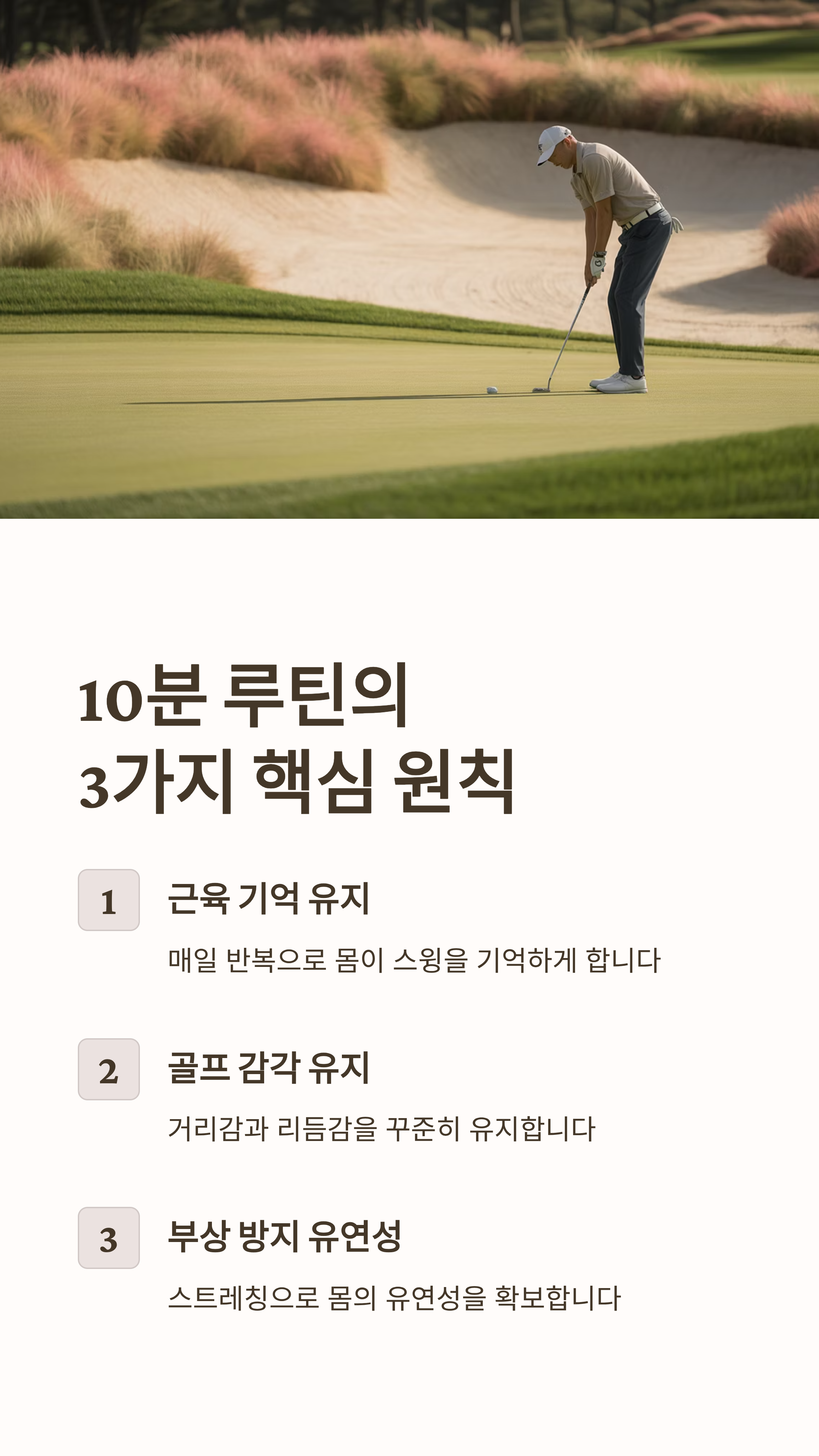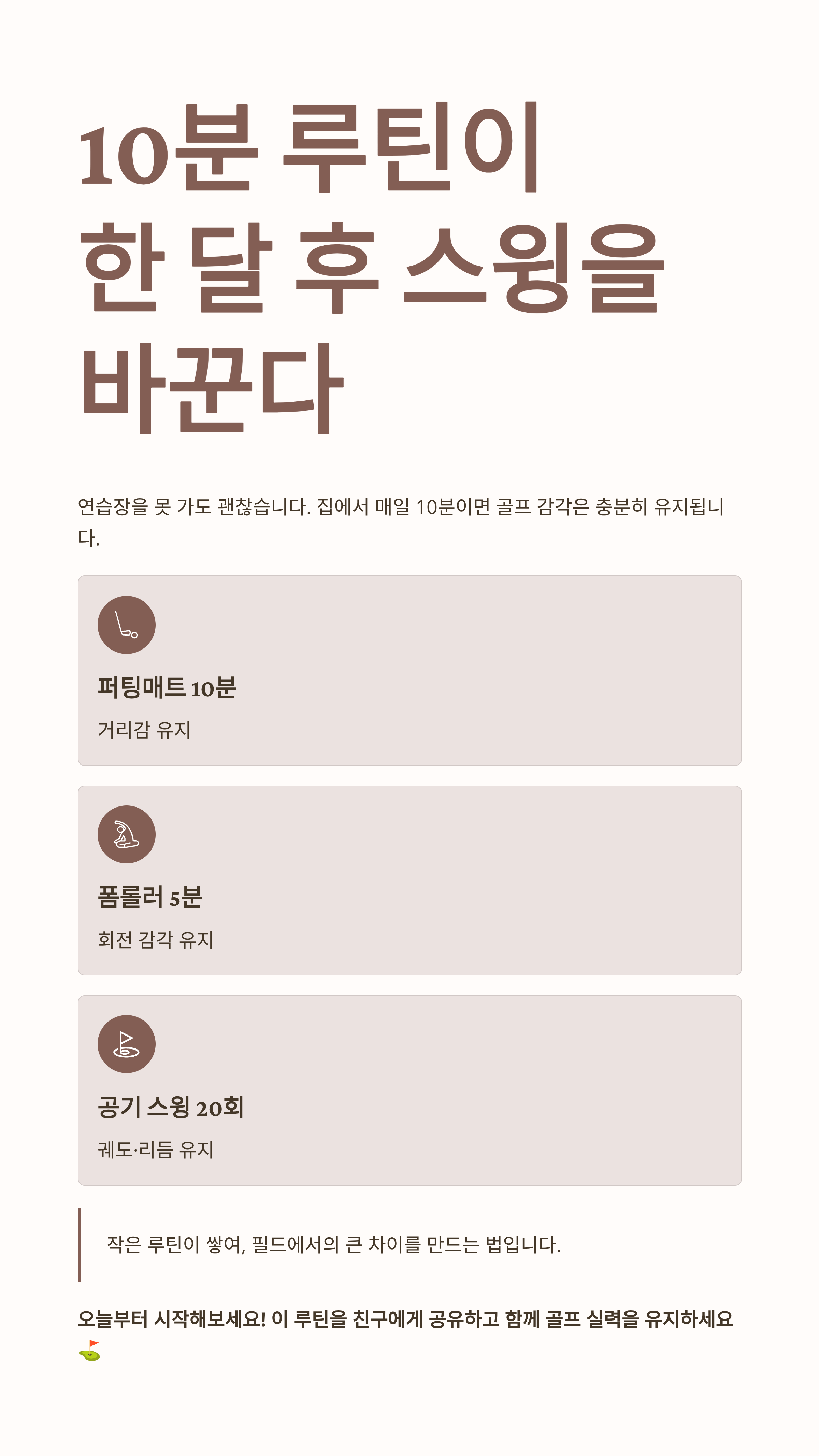 그래서 골프는 1시간 연습보다 매일 10분 루틴이 훨씬 가치 있습니다.