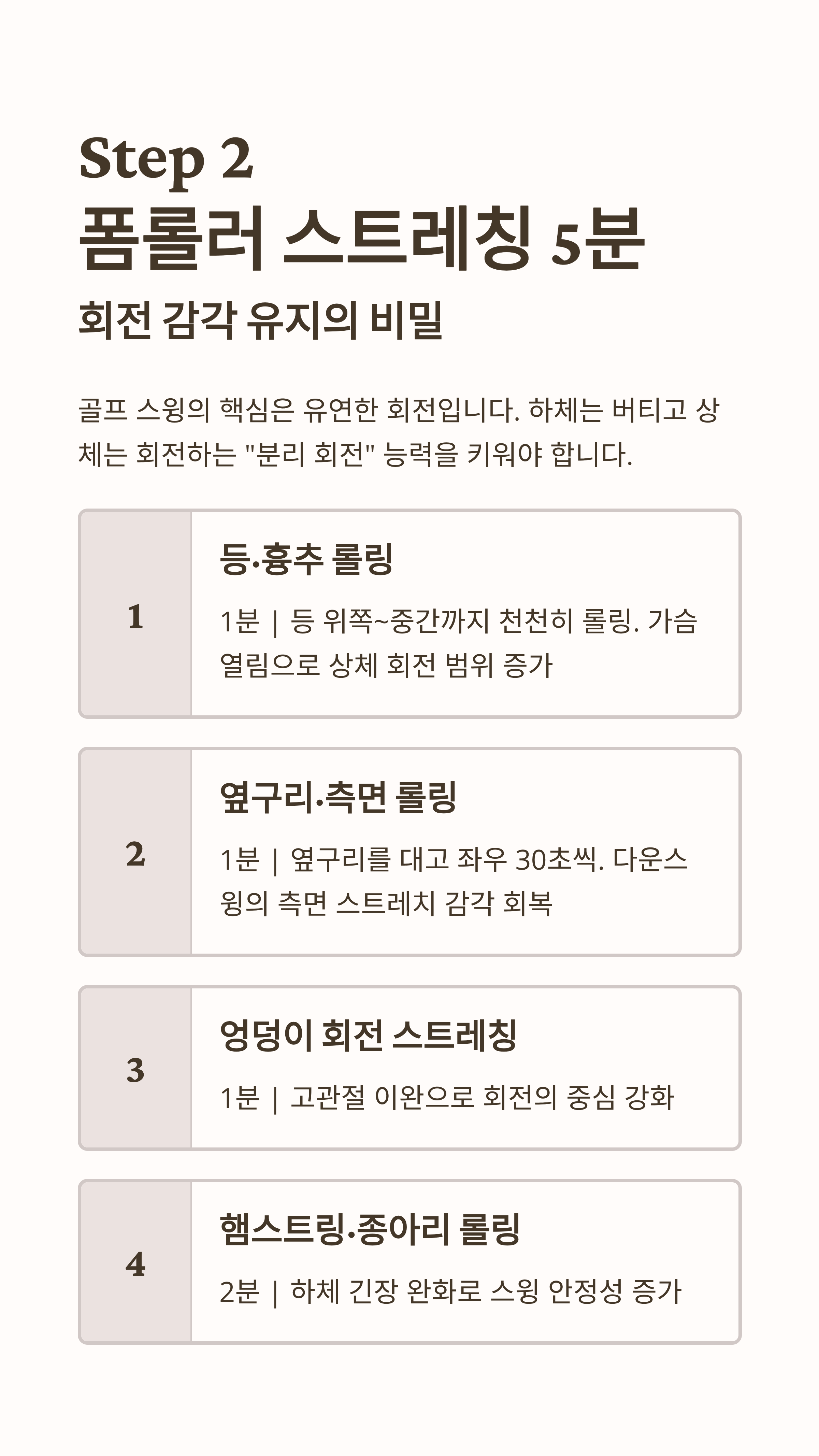 👉 폼롤러 스트레칭은 골프 스윙의 핵심인 회전 + 밸런스 + 부드러움을 유지하게 해 줍니다.