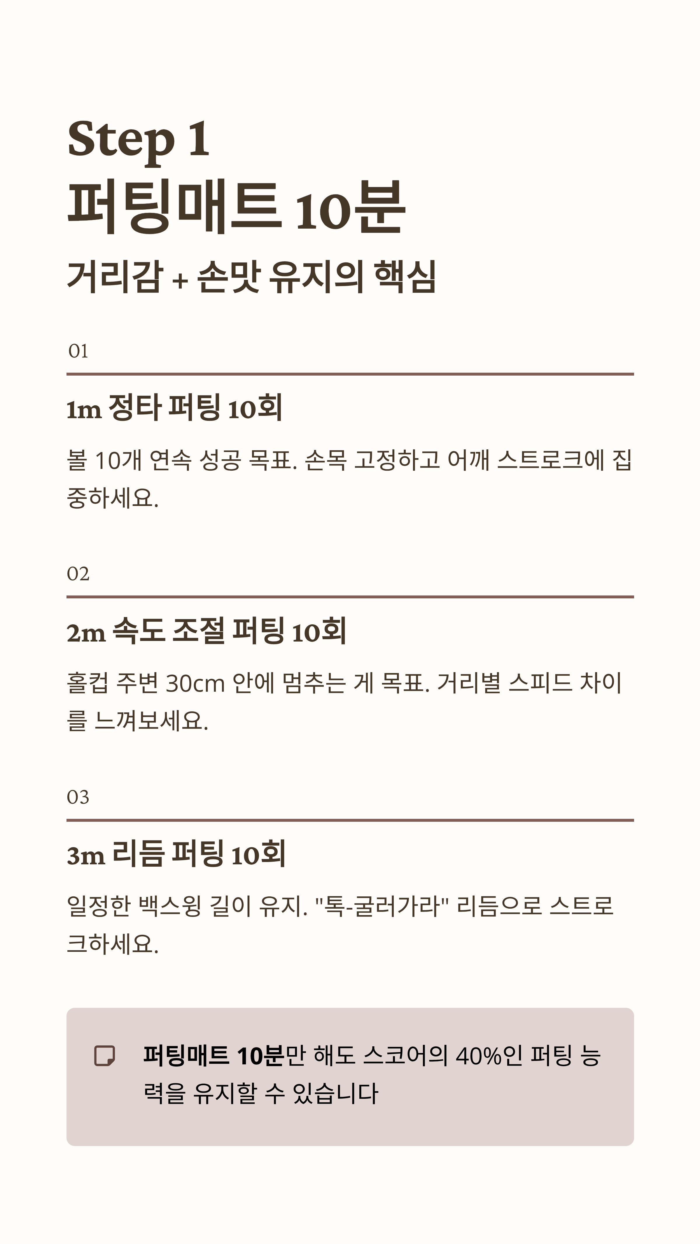 3. Step 1 – 퍼팅매트 10분 (거리감 + 손맛 유지)