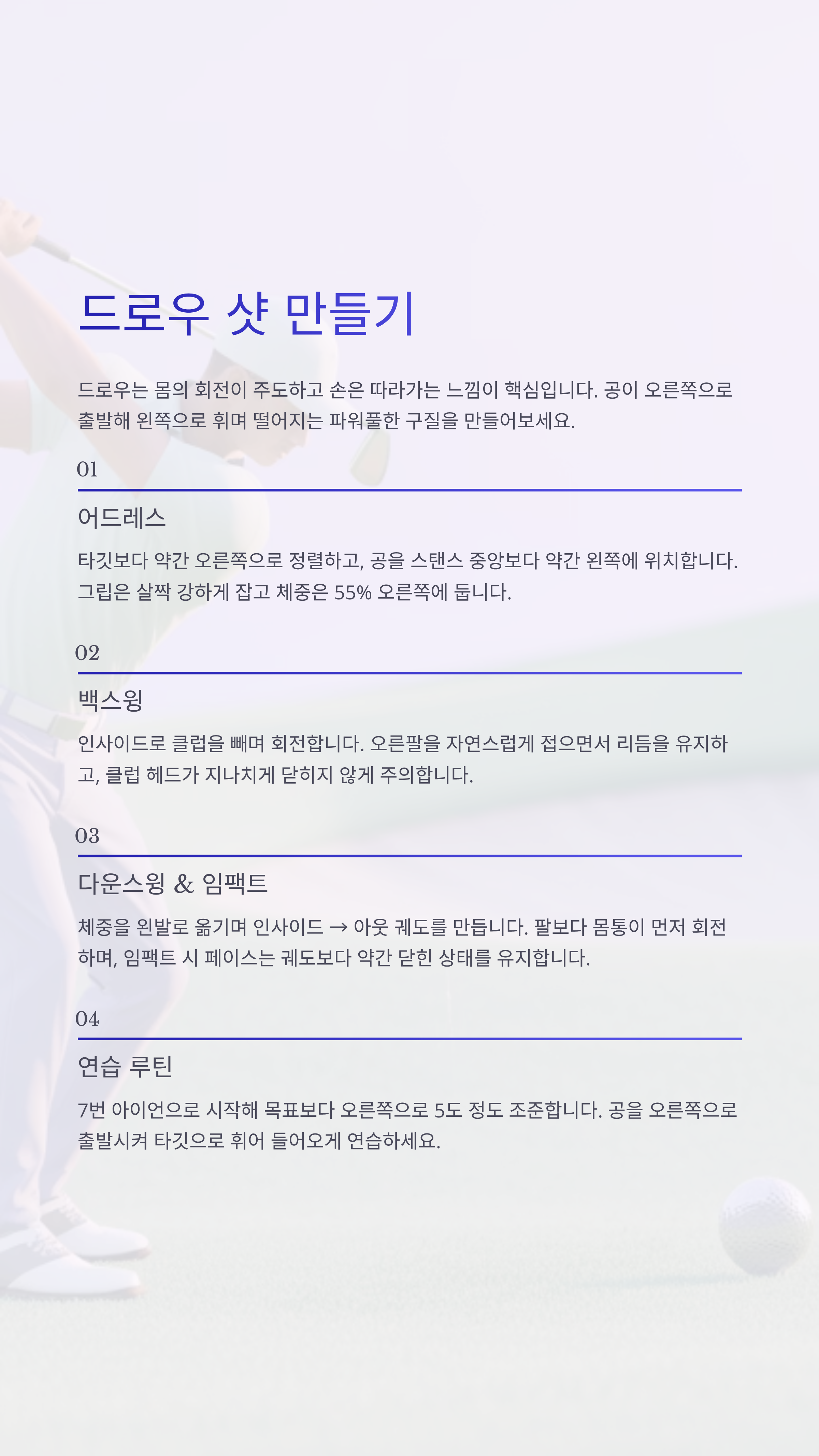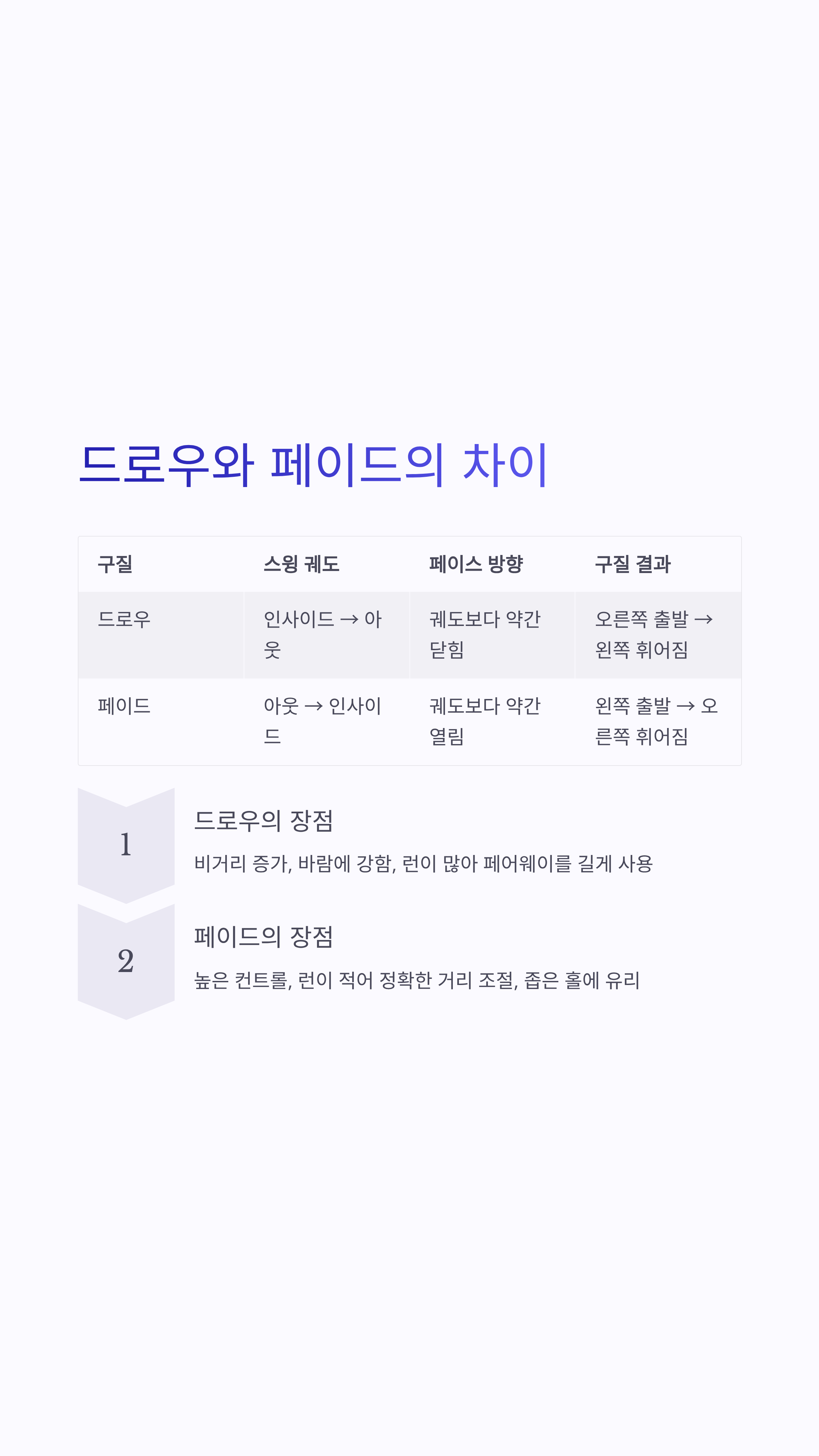이번 글에서는 드로우와 페이드의 원리, 셋업, 스윙 교정 루틴까지 실전 중심으로 자세히 다뤄보겠습니다.