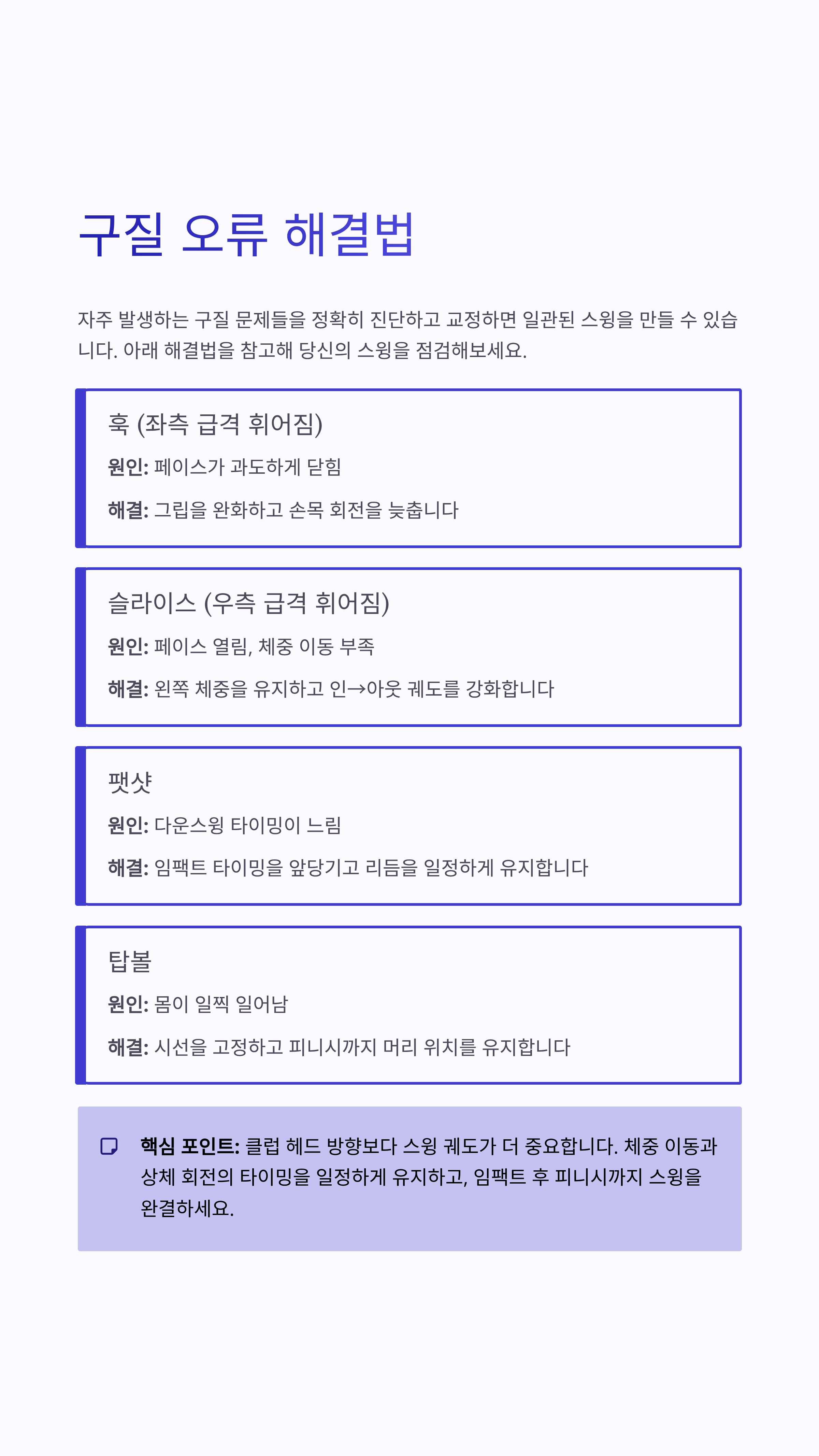 | 슬라이스 (우측 급격 휘어짐) | 페이스 열림, 체중 이동 부족 | 왼쪽 체중 유지, 인→아웃 궤도 강화 |