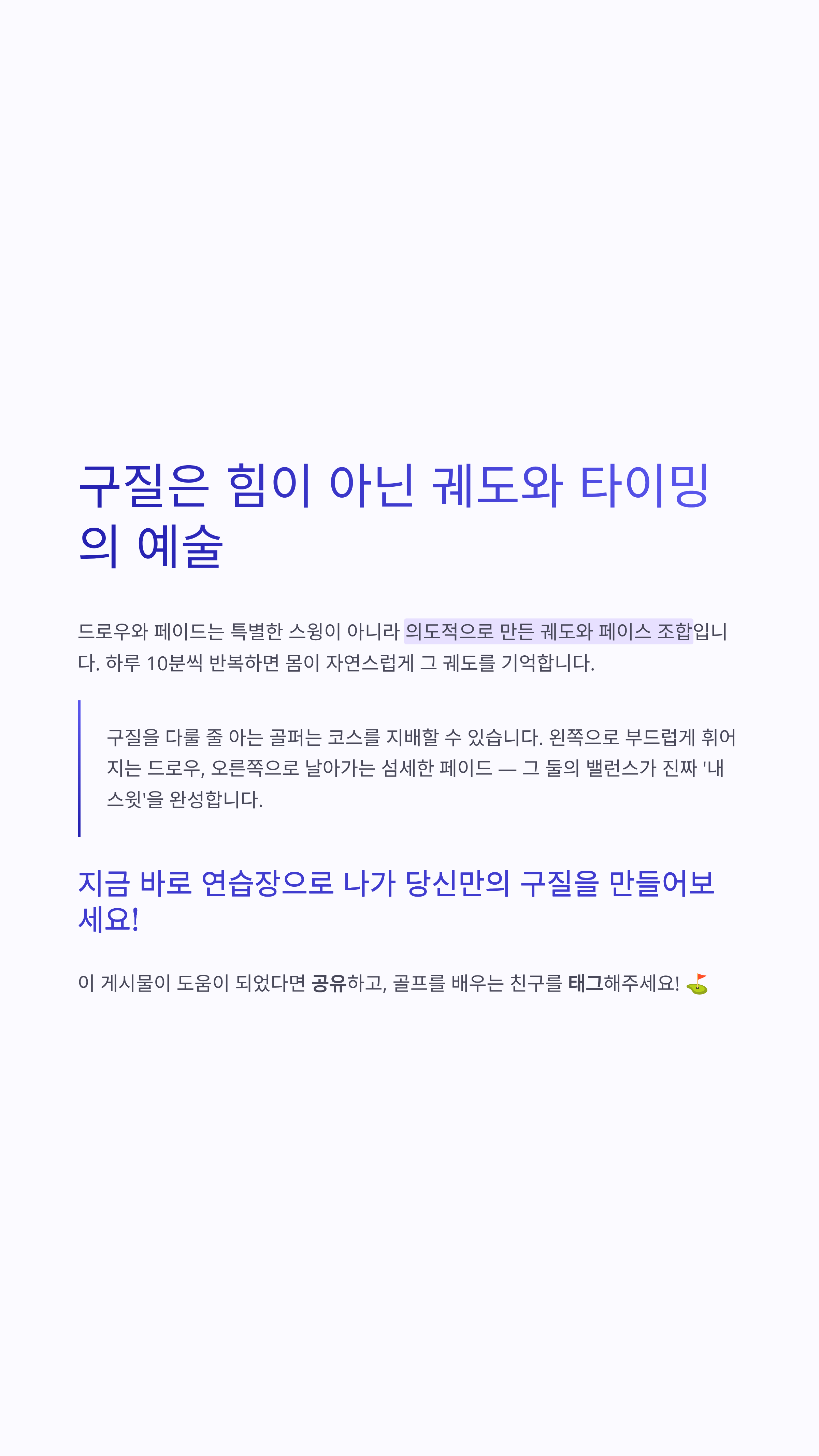 드로우와 페이드는 특별한 스윙이 아니라, 의도적으로 만든 궤도와 페이스 조합입니다. 처음엔 어려워도, 하루 10분씩 반복하면 몸이 자연스럽게 그 궤도를 기억합니다. 결국 구질을 다룰 줄 아는 골퍼는 코스를 지배할 수 있습니다. 이제 당신의 구질을 만들어보세요 — 왼쪽으로 부드럽게 휘어지는 드로우, 오른쪽으로 날아가는 섬세한 페이드. 그 둘의 밸런스가 진짜 ‘내 스윙’을 완성합니다.