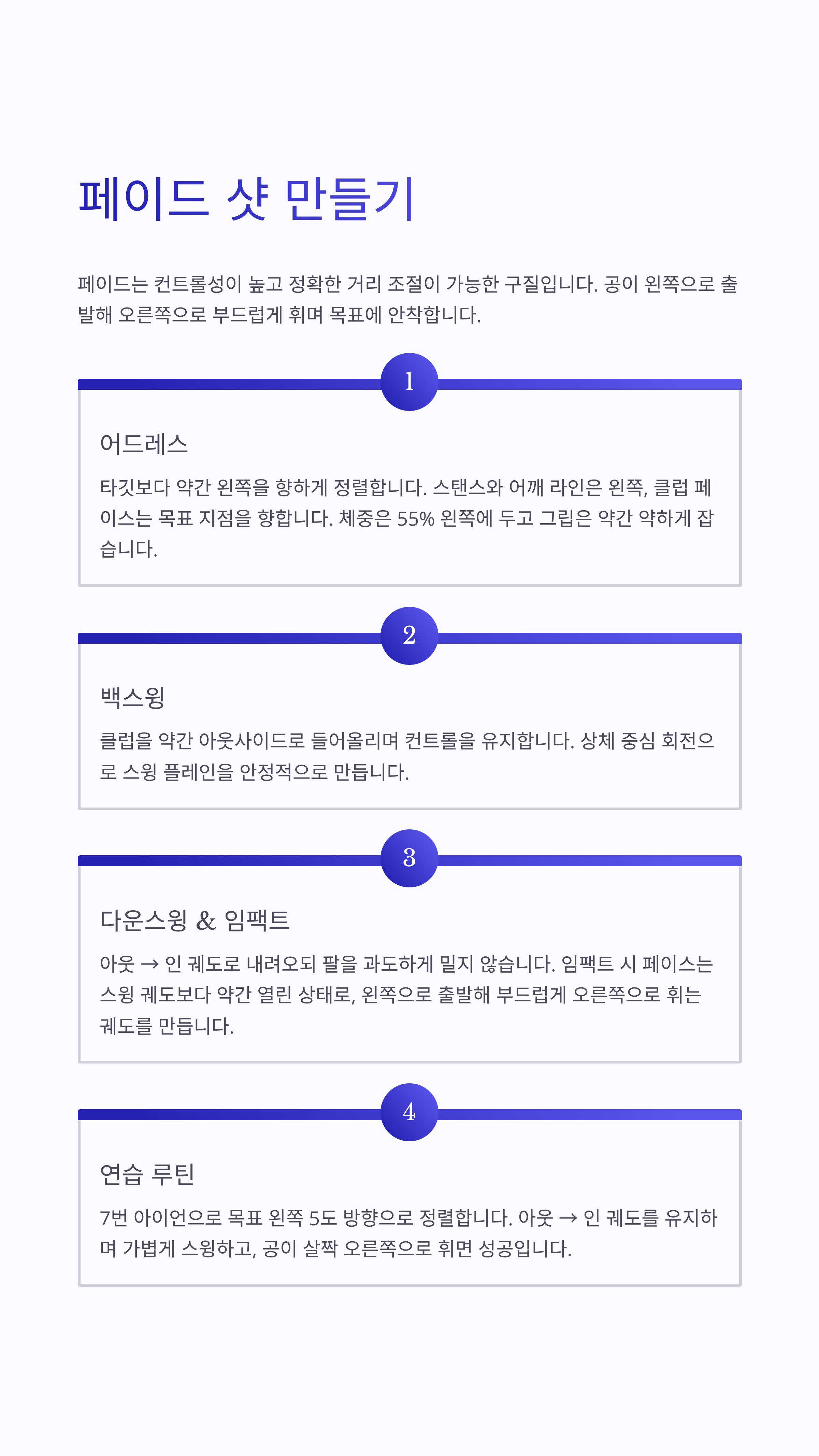 페이드 샷은 공이 왼쪽으로 출발해 오른쪽으로 부드럽게 휘는 구질입니다. 컨트롤성이 높고, 런이 적어 정확한 거리 조절이 가능합니다.