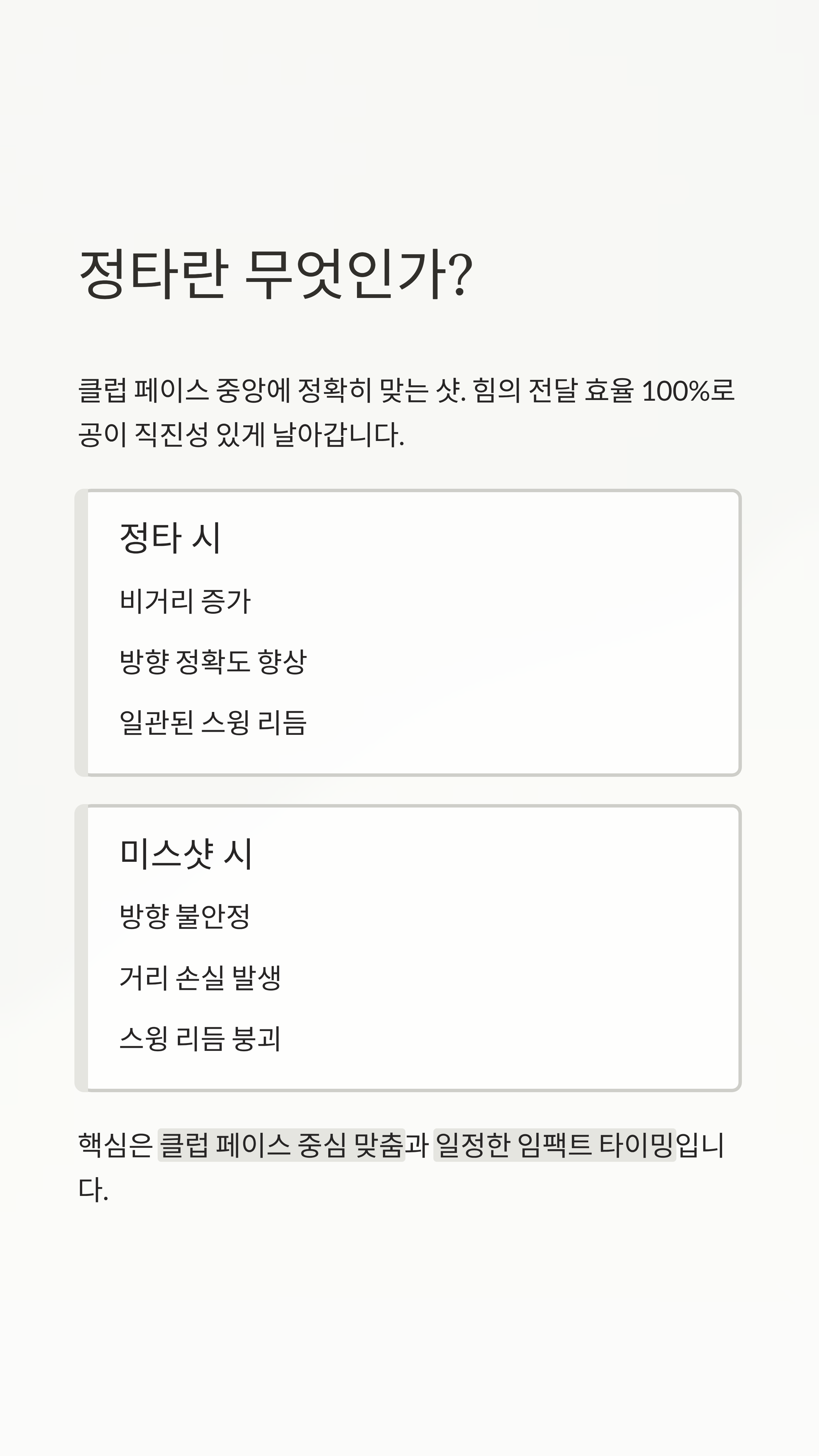 정타를 만드는 핵심은 클럽 페이스 중심 맞춤 + 일정한 임팩트 타이밍입니다.