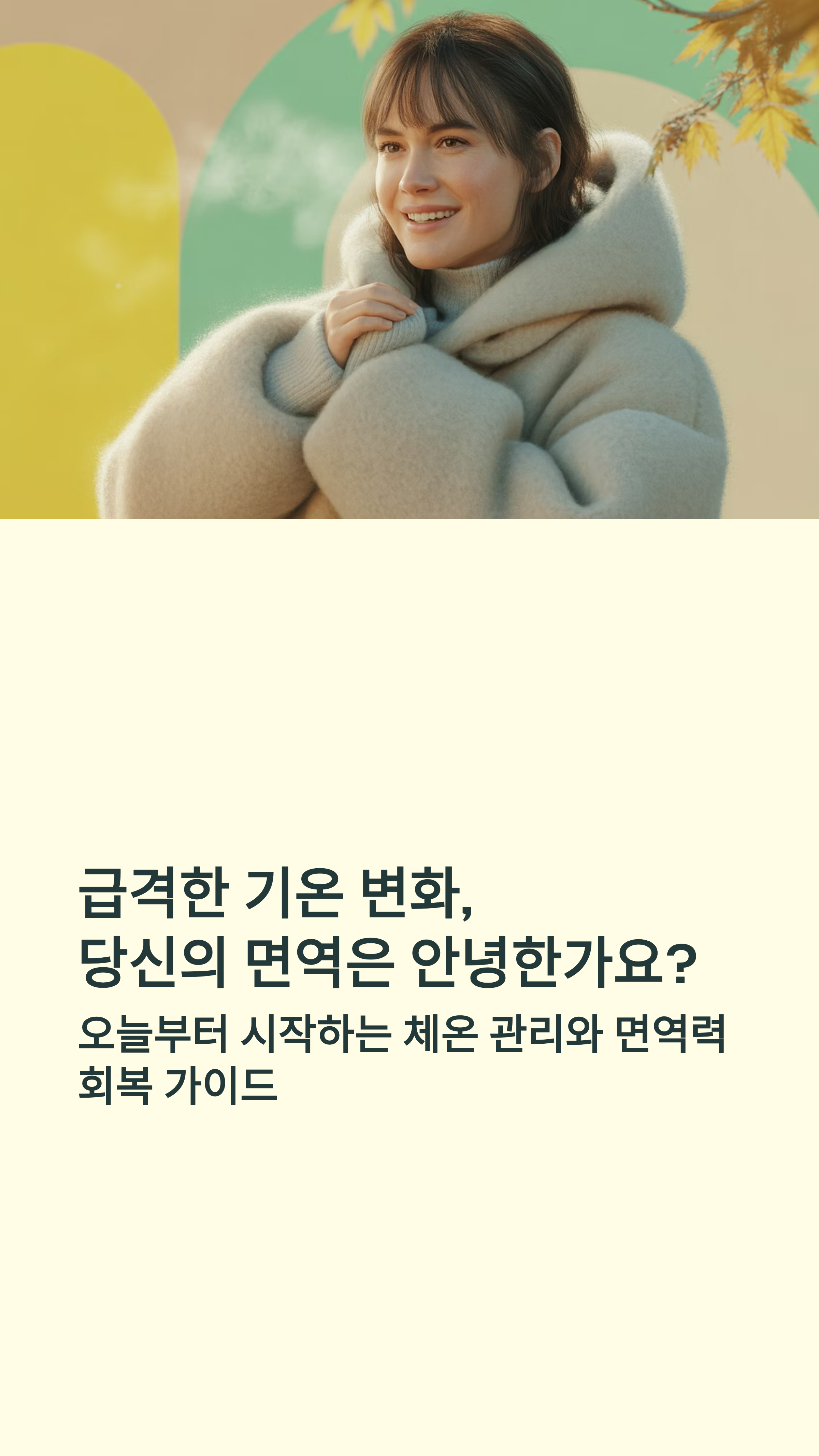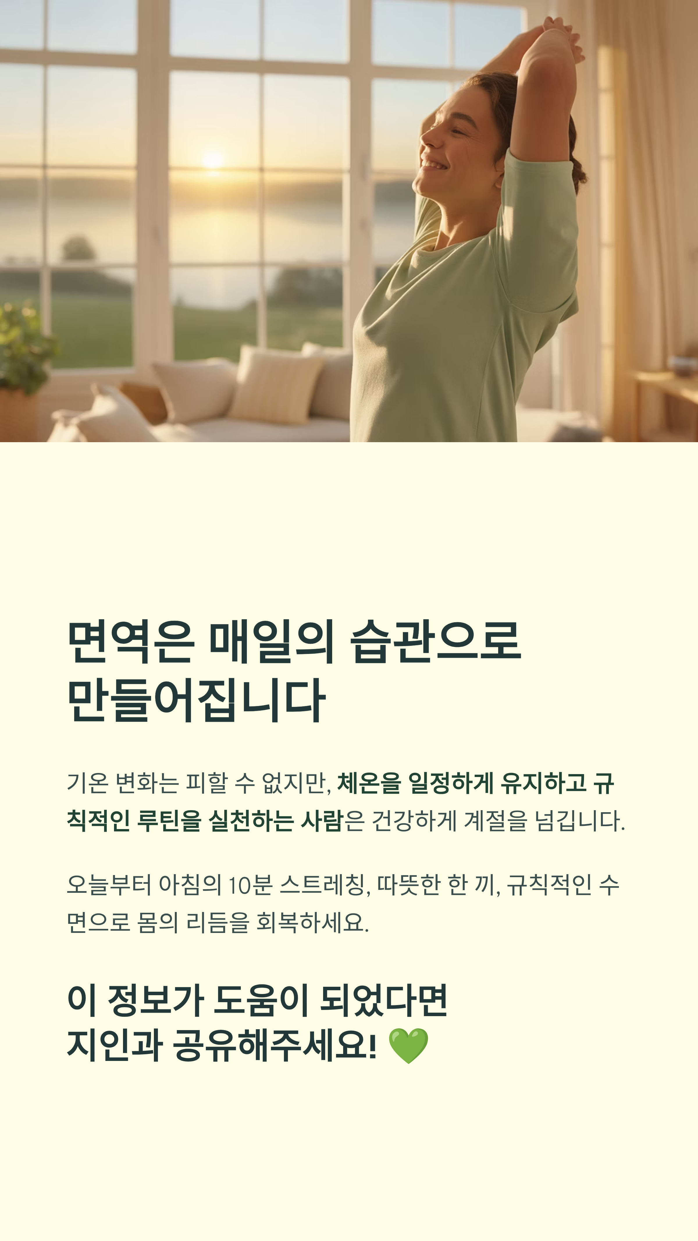 기온 변화는 누구에게나 피할 수 없는 자연의 흐름입니다. 하지만 체온을 일정하게 유지하고, 규칙적인 루틴을 실천하는 사람은 피로하지 않고 건강하게 계절을 넘깁니다. 오늘부터 아침의 10분 스트레칭, 따뜻한 한 끼, 규칙적인 수면으로 몸의 리듬을 회복하세요. 면역은 특별한 약이 아니라 매일의 습관으로 만들어집니다.