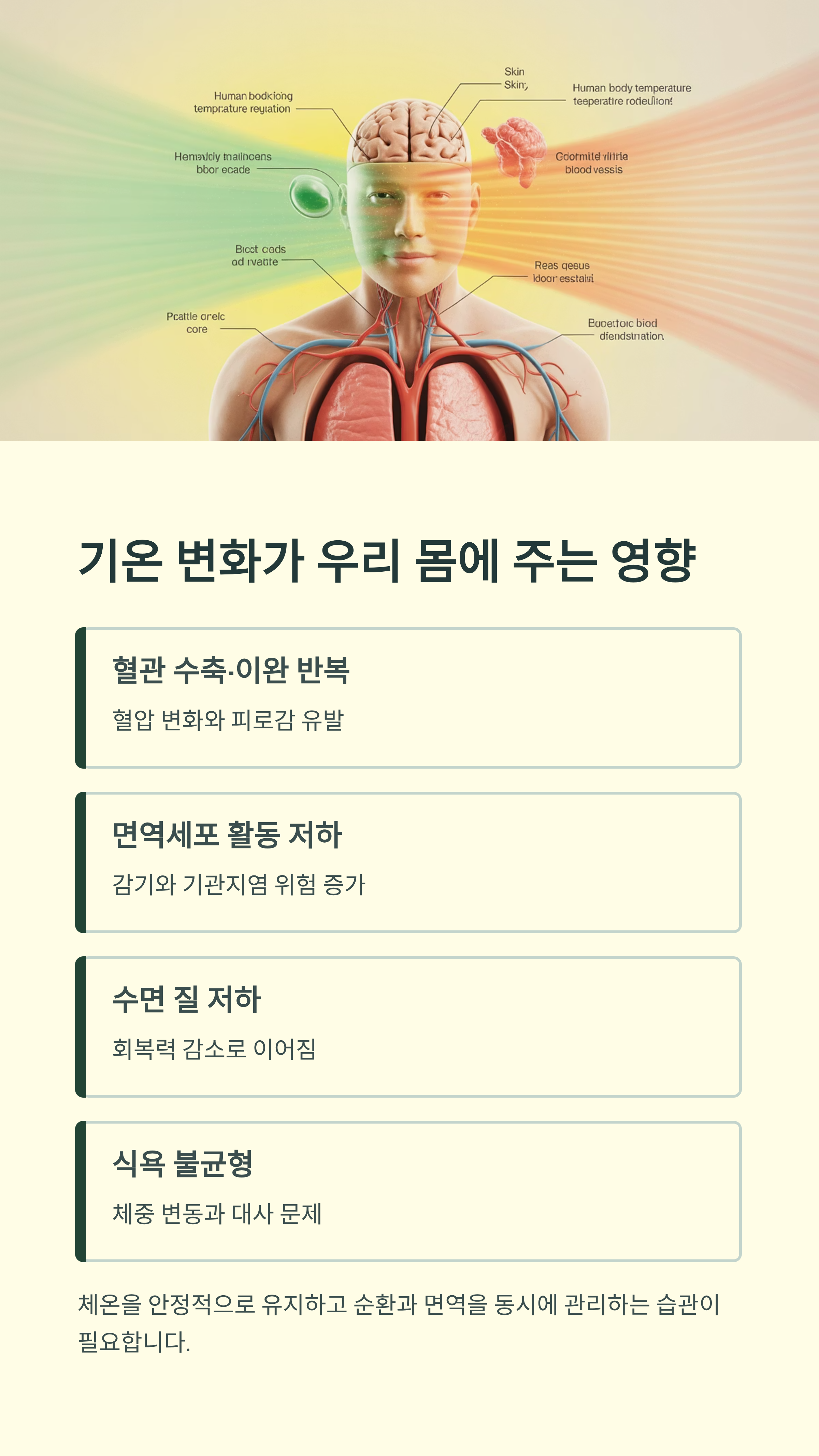 👉 따라서 체온을 안정적으로 유지하고, 순환과 면역을 동시에 관리하는 습관이 필요합니다.