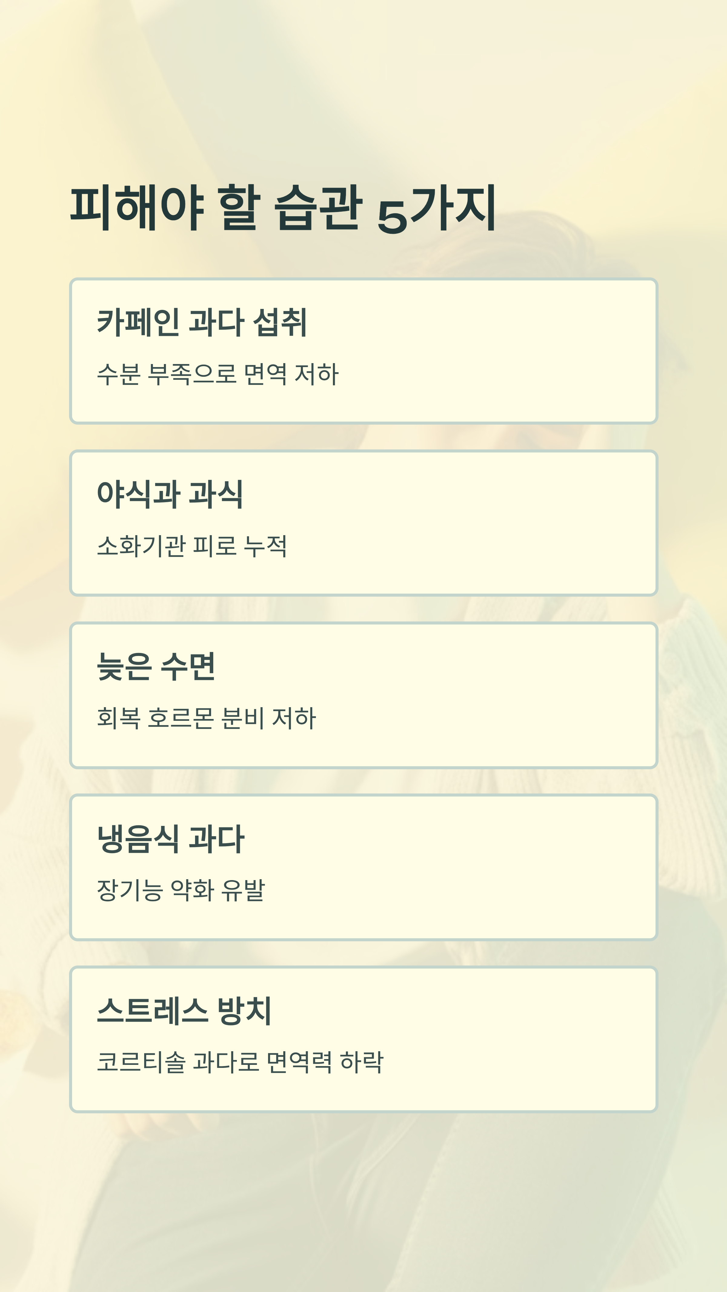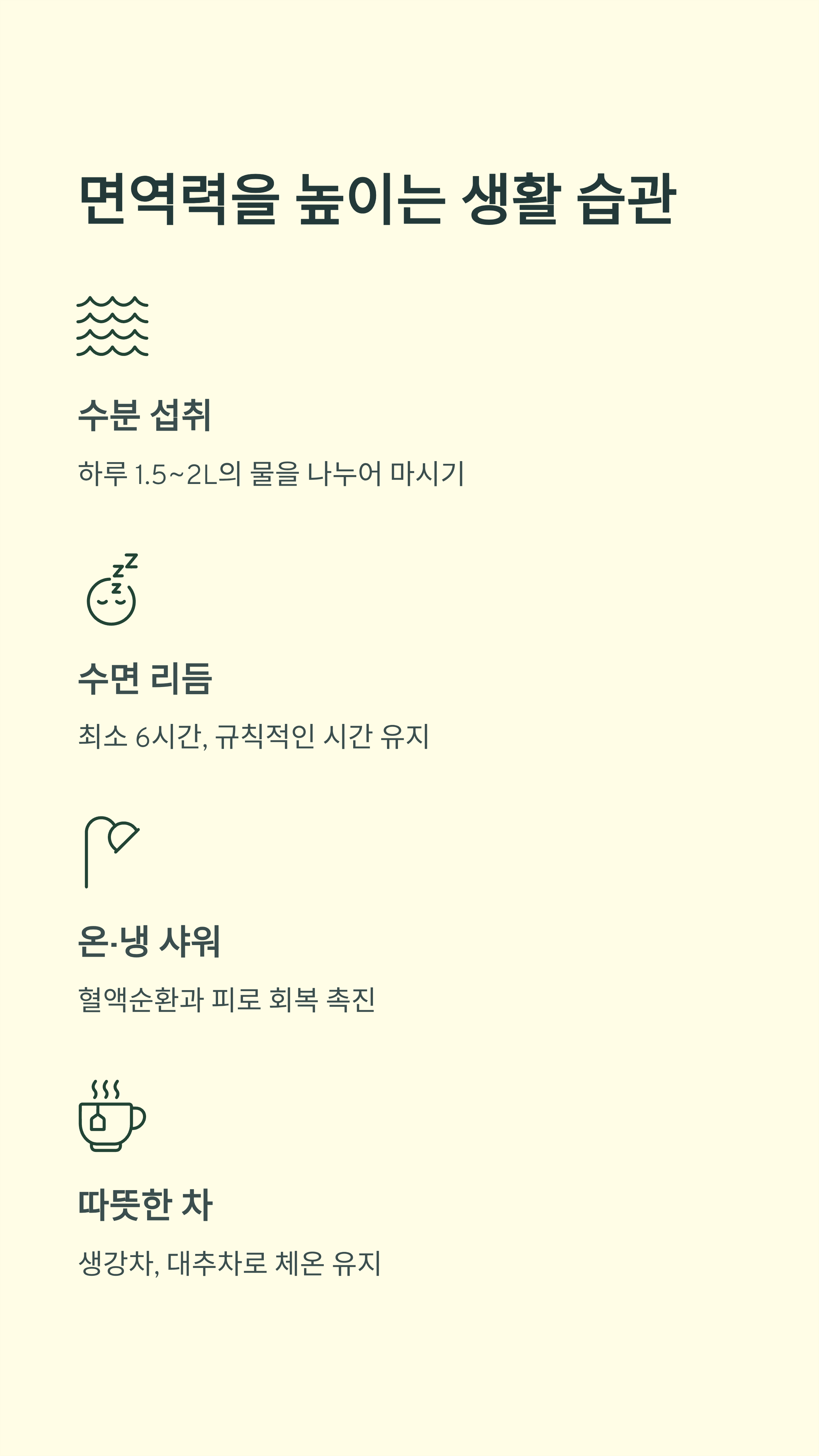 - ❌ 카페인 과다 섭취 → 수분 부족으로 면역 저하