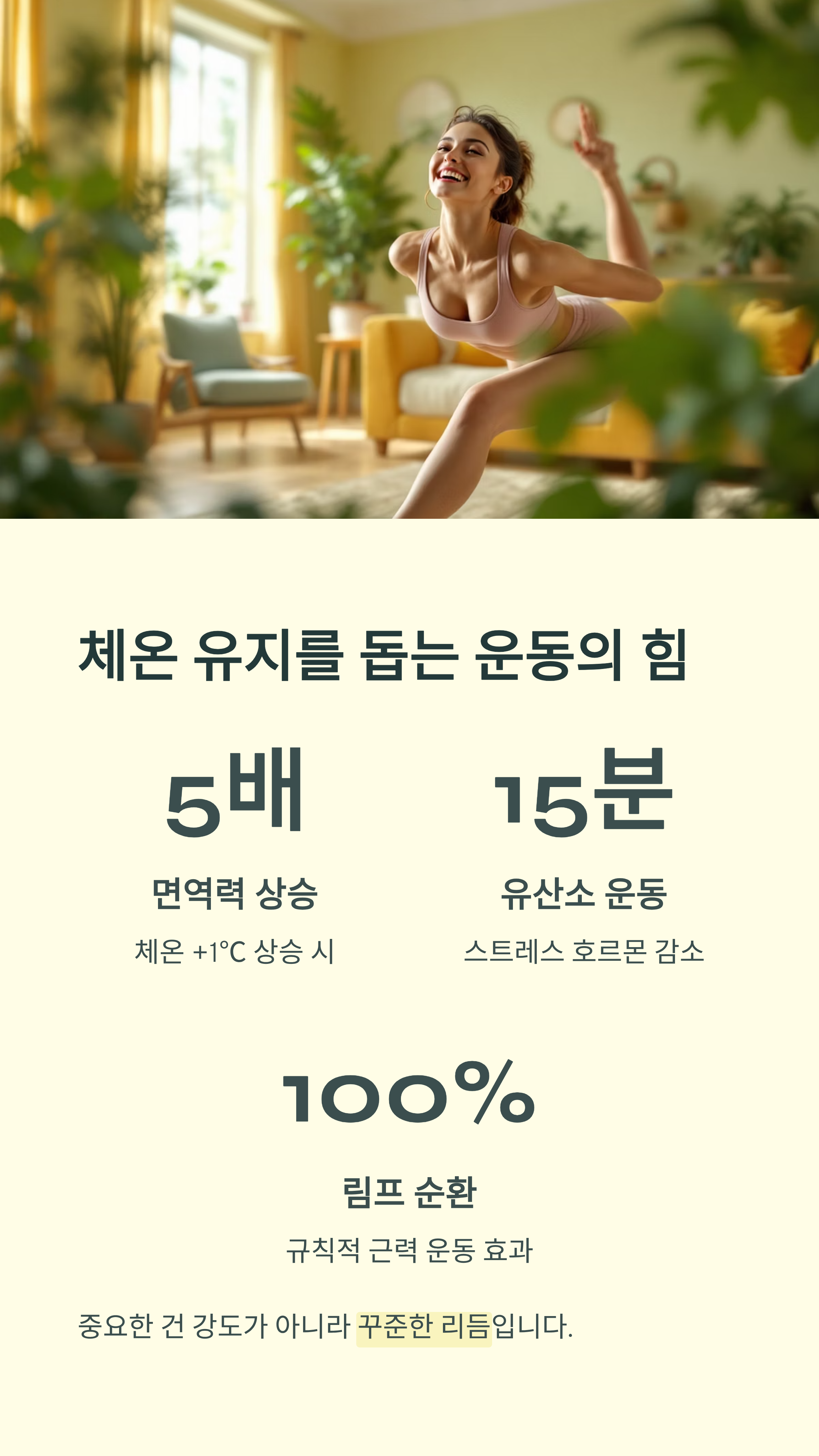 운동은 체온을 올리는 가장 효과적인 자연 면역 강화법입니다. 가벼운 움직임이라도 근육의 열 생산량이 늘어나며, 혈액순환이 개선되어 면역세포가 활성화됩니다.