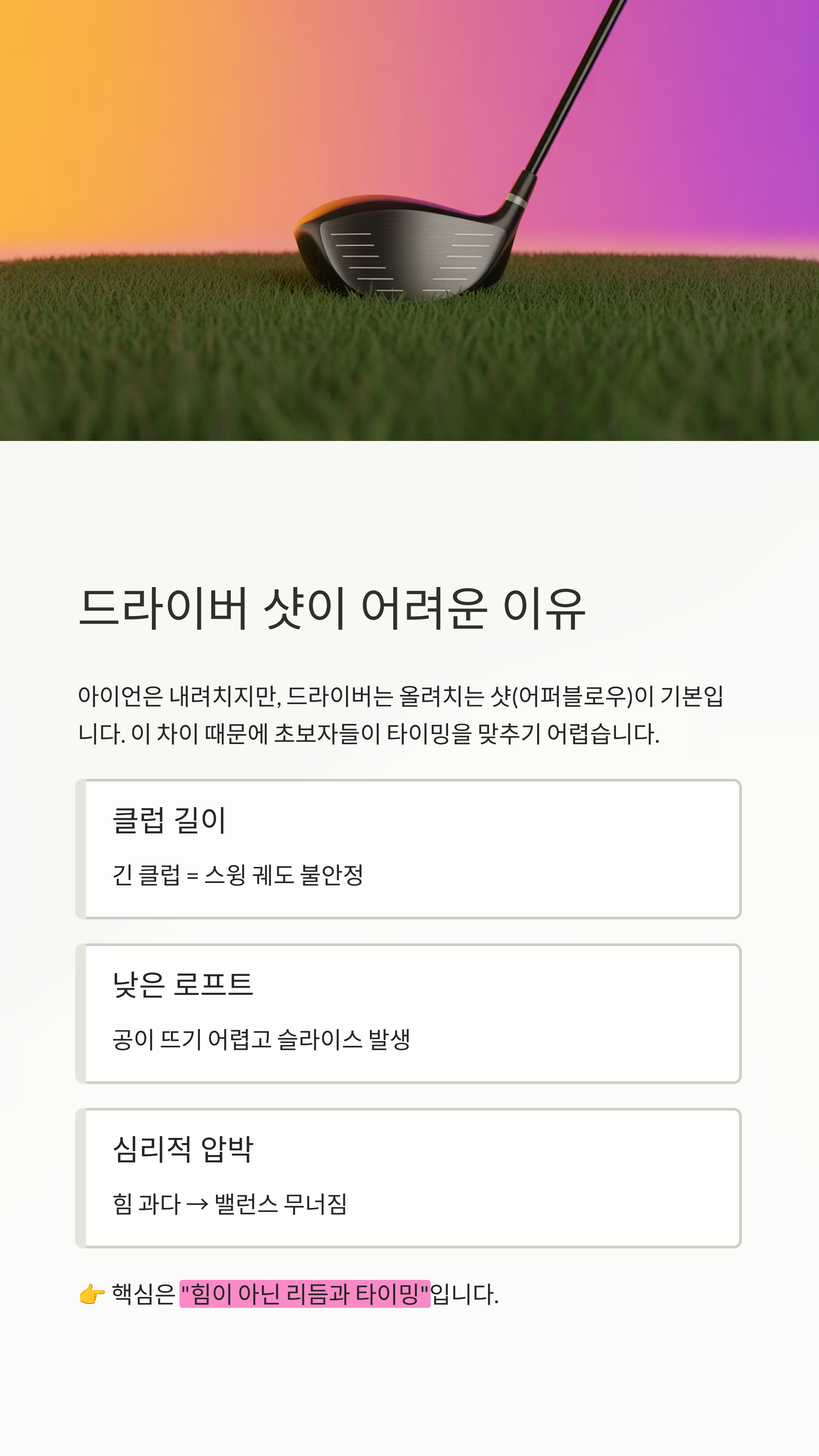 아이언은 내려치지만, 드라이버는 올려치는 샷(어퍼블로우)이 기본입니다. 이 차이 때문에 초보자들이 타이밍을 맞추기 어렵습니다. 또한 드라이버는 클럽 길이가 길고 로프트가 낮기 때문에 작은 스윙 오류도 비거리 손실과 방향성 문제로 이어집니다.
