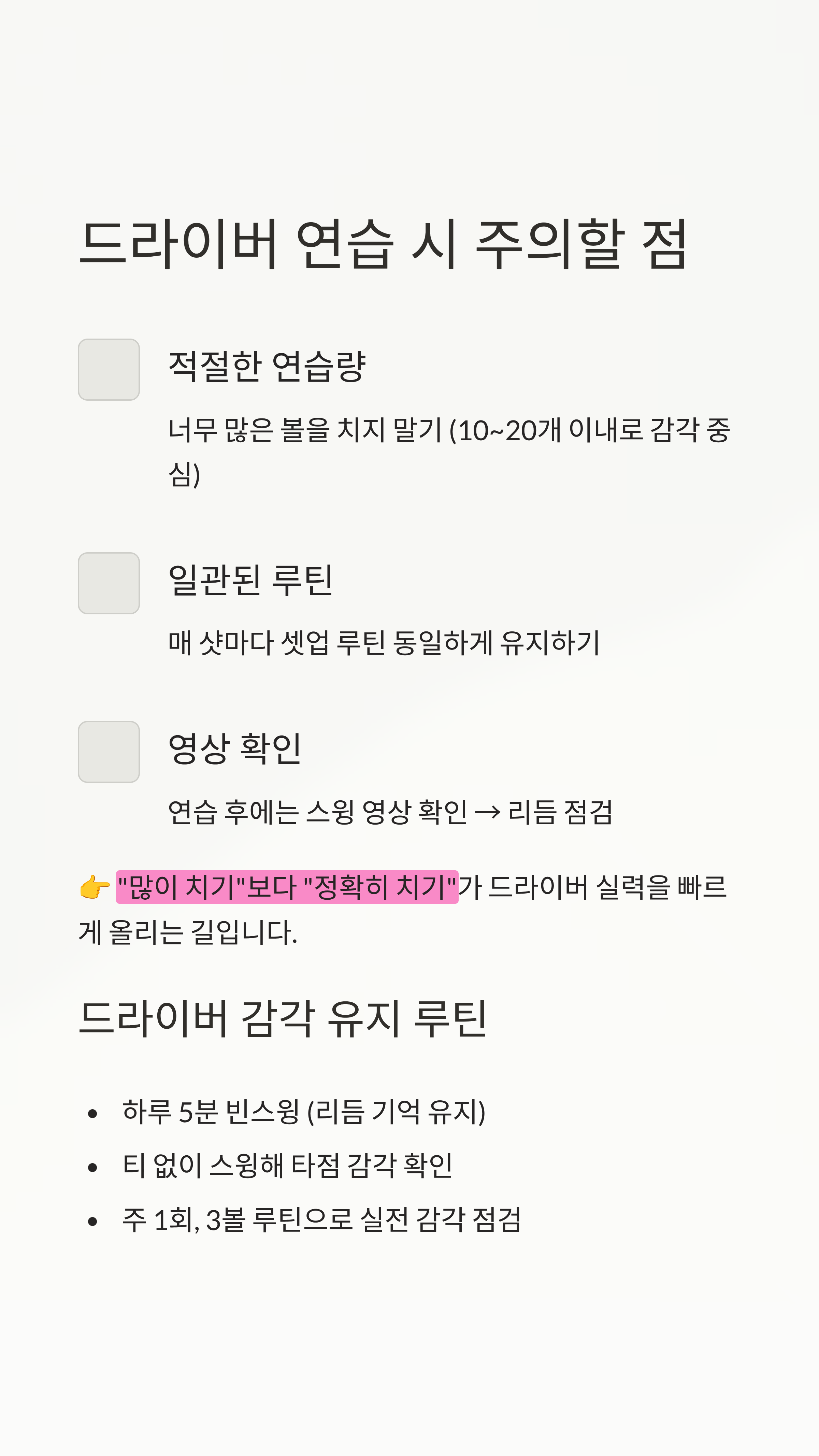 👉 “많이 치기”보다 “정확히 치기”가 드라이버 실력을 빠르게 올리는 길입니다.