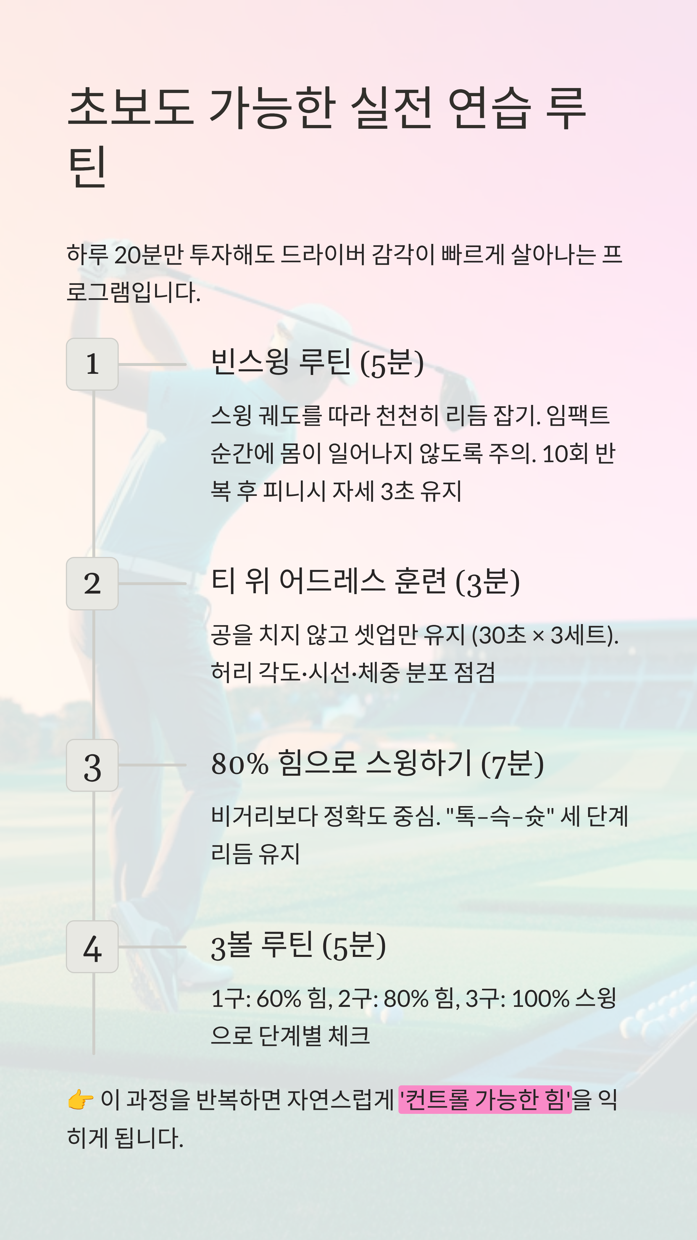 아래 루틴은 하루 20분만 투자해도 드라이버 감각이 빠르게 살아나는 프로그램입니다.