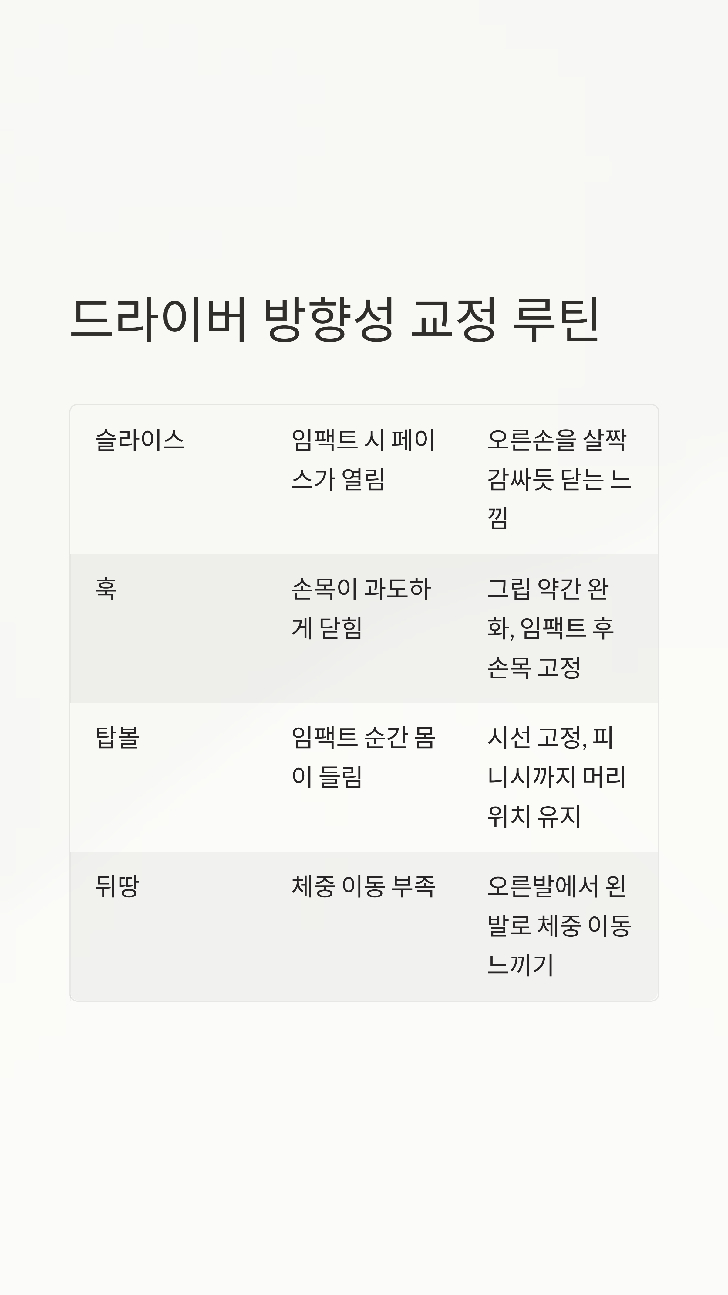 | 슬라이스 | 임팩트 시 페이스가 열림 | 오른손을 살짝 감싸듯 닫는 느낌 |