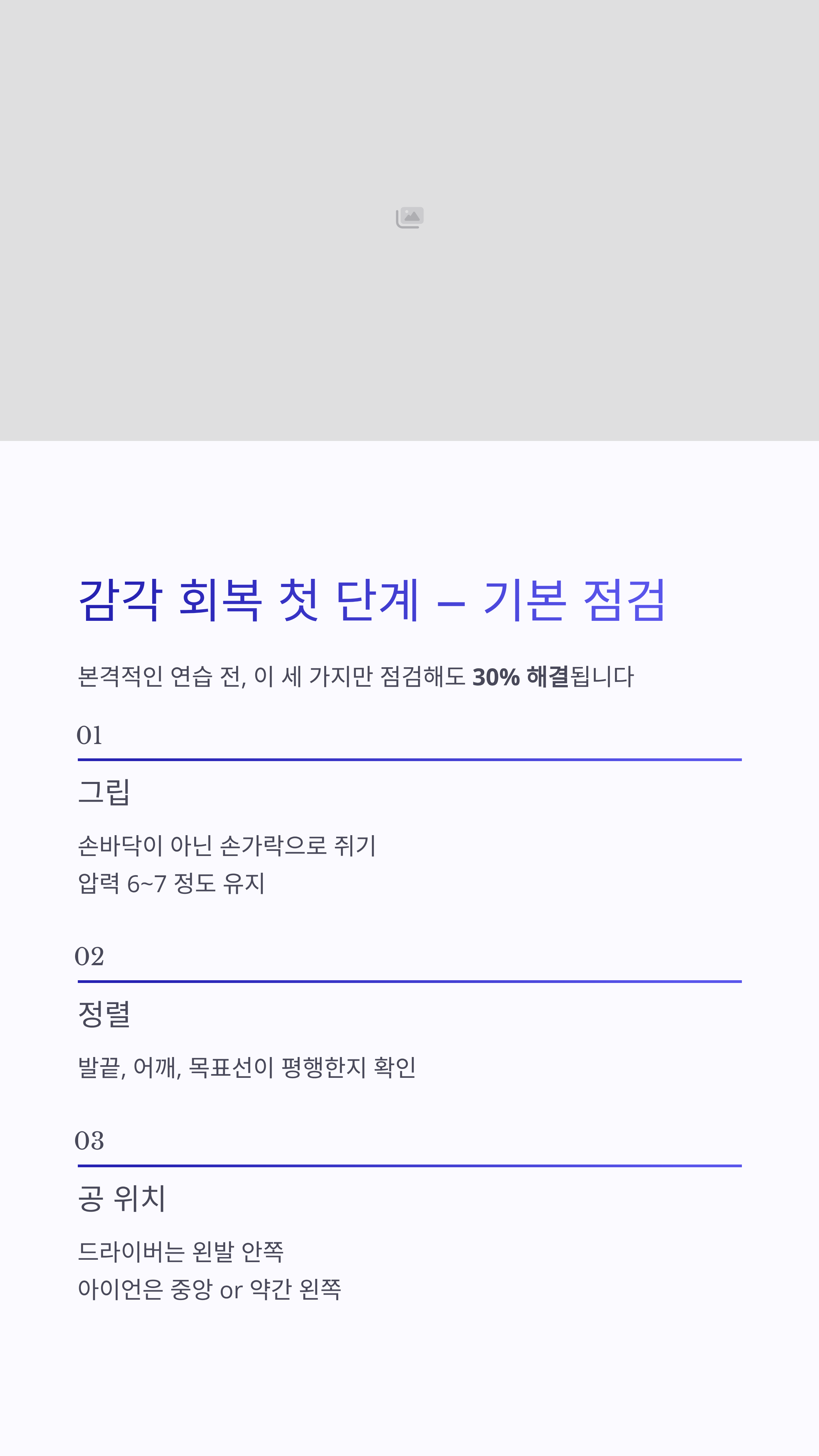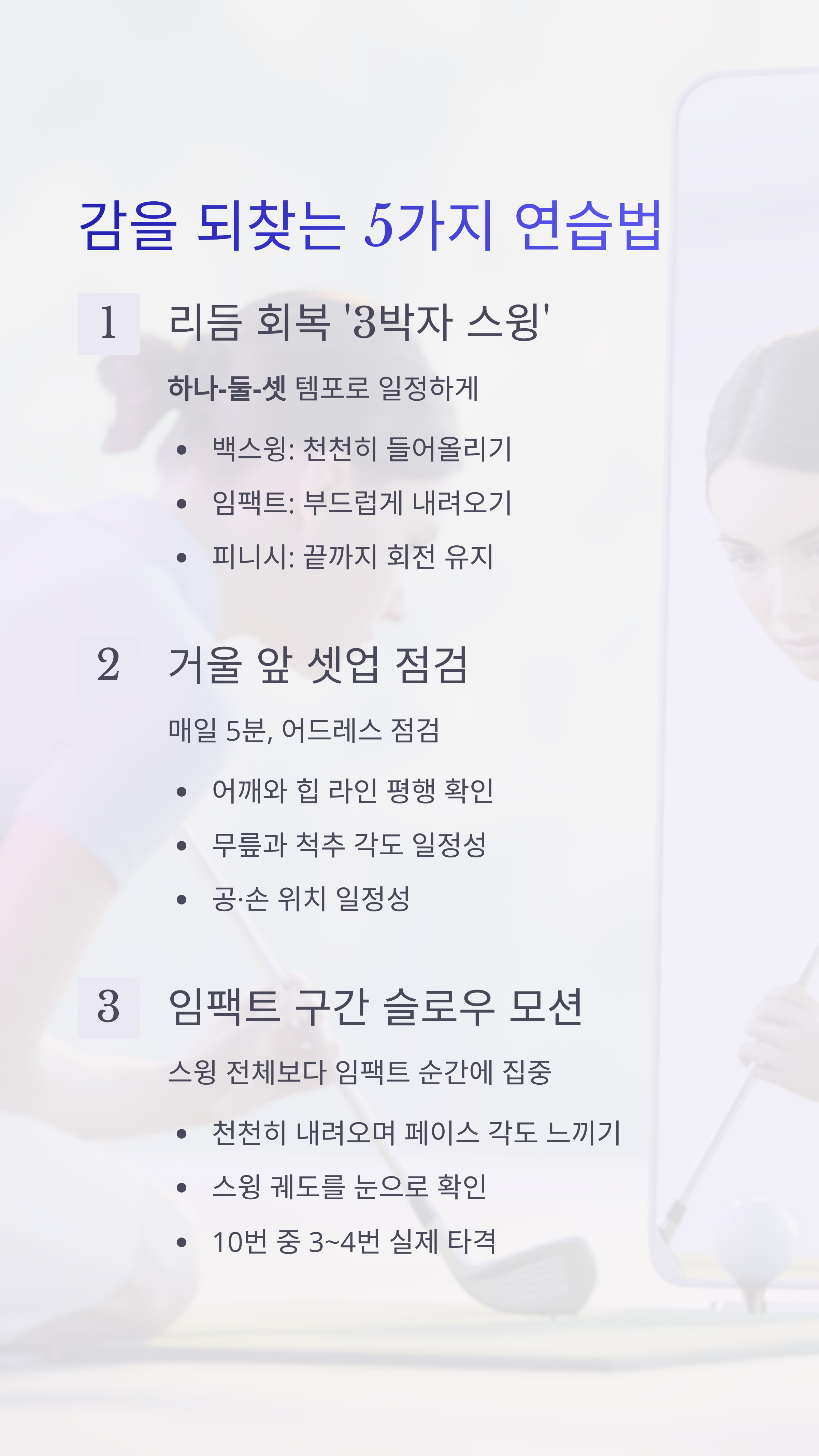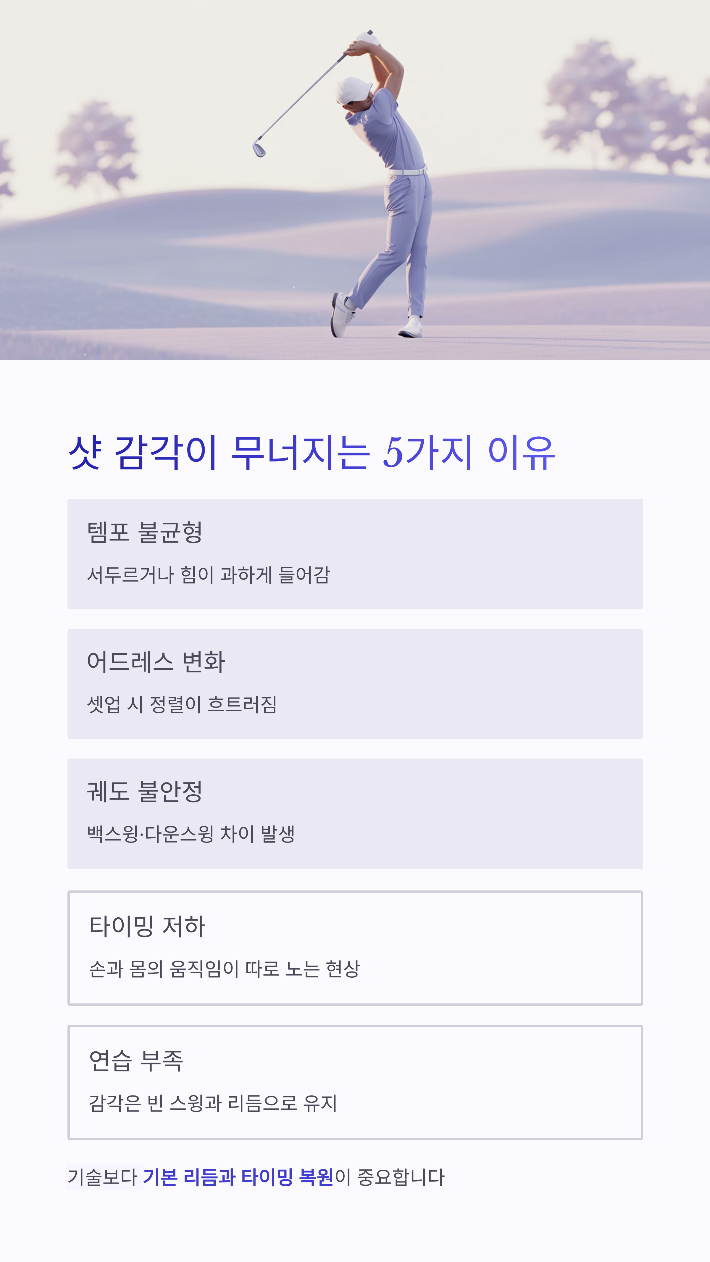 - 연습 부족 – 감각은 ‘빈 스윙과 리듬’으로 유지해야 함