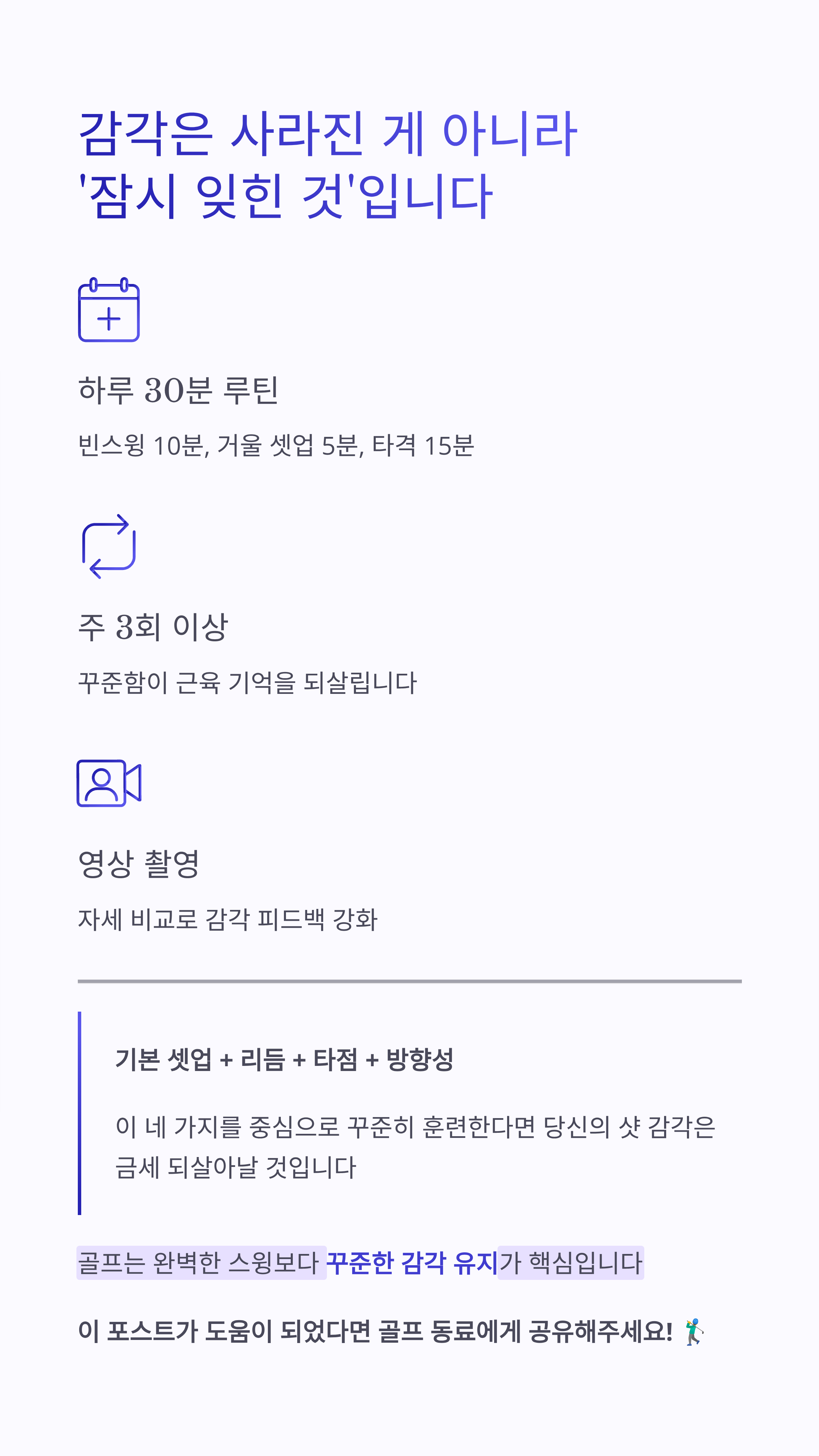골프는 완벽한 스윙보다 꾸준한 감각 유지가 핵심입니다.
