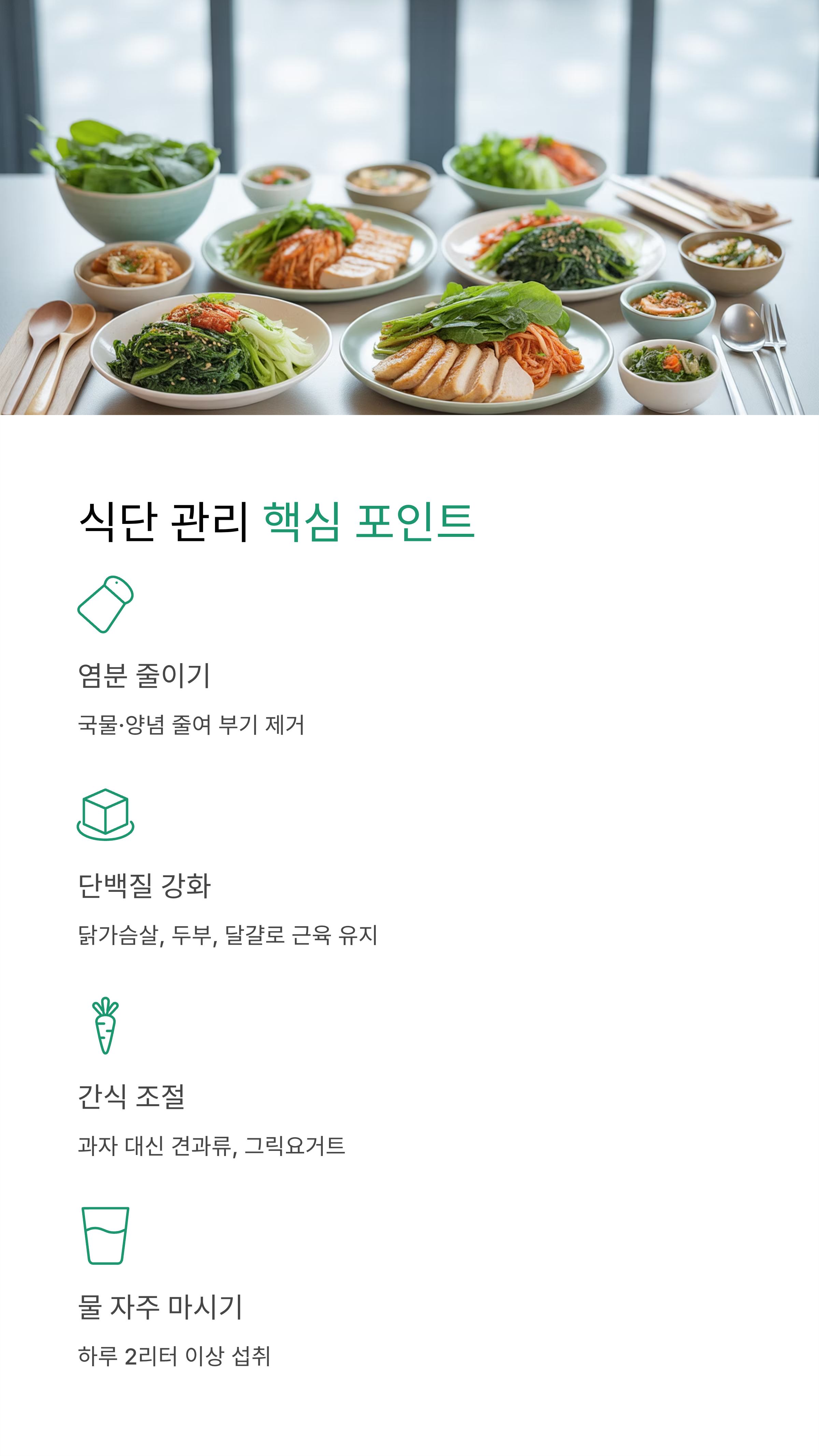 - 염분 줄이기: 국물·양념 줄이기 → 부기와 체중을 빠르게 회복