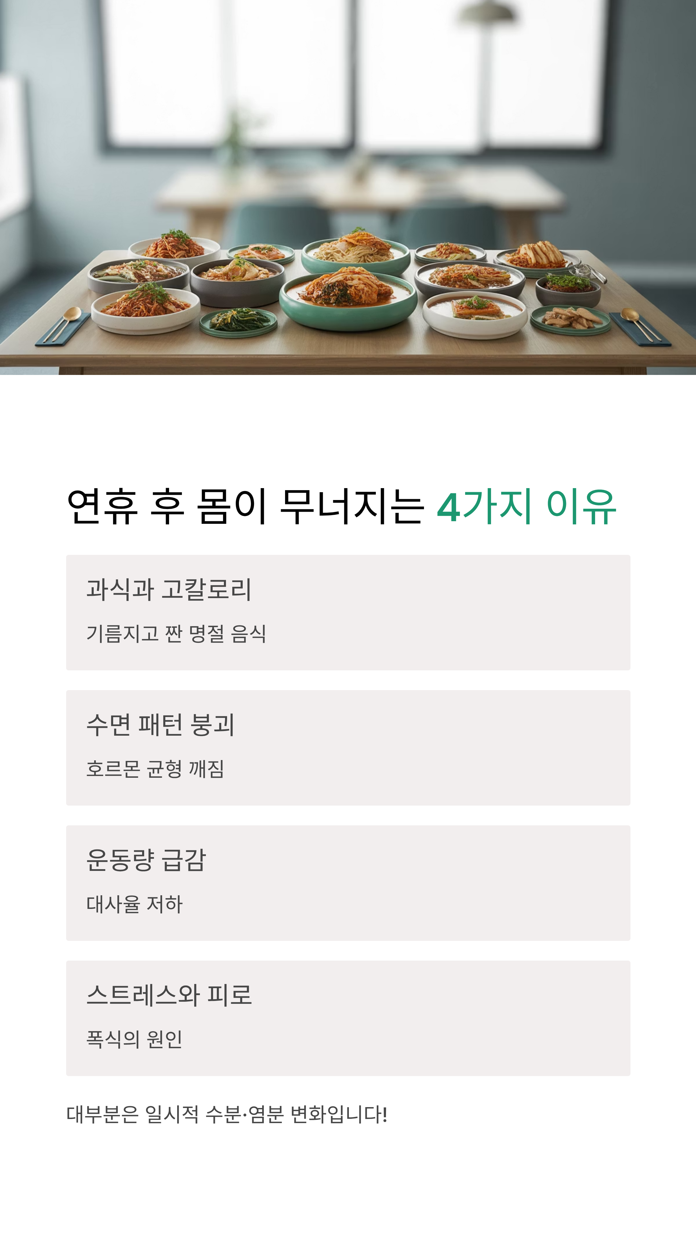 👉 하지만 체중 증가의 대부분은 ‘지방’보다 일시적인 수분·염분 변화입니다. 3~5일만 올바르게 관리해도 충분히 회복할 수 있습니다.
