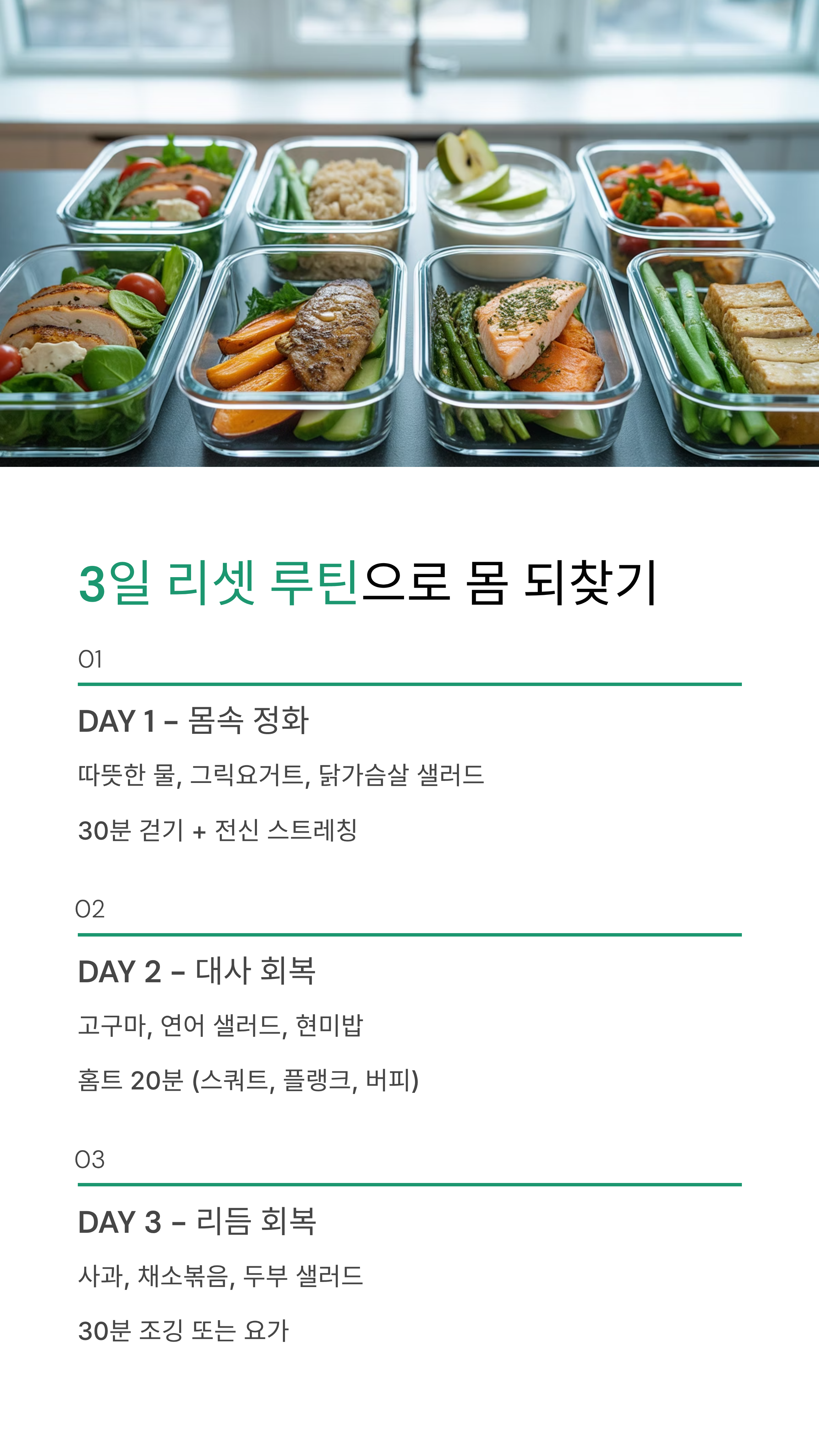 무너진 몸을 되돌리는 핵심은 무리한 단식이 아니라 균형 회복입니다. 다음 3일 루틴을 꾸준히 실천해보세요.