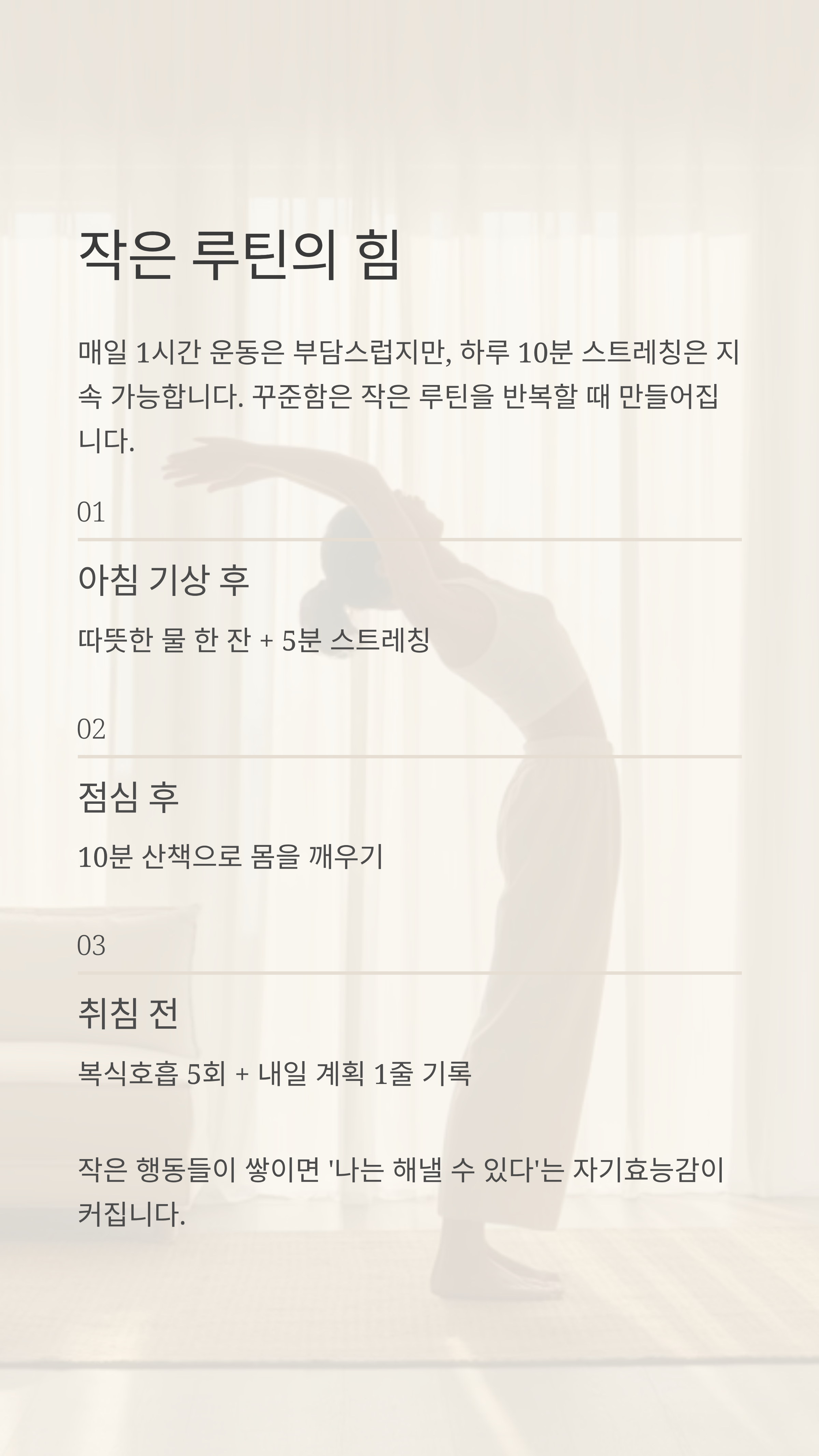 - 🌅 아침 기상 후 따뜻한 물 한 잔 + 5분 스트레칭