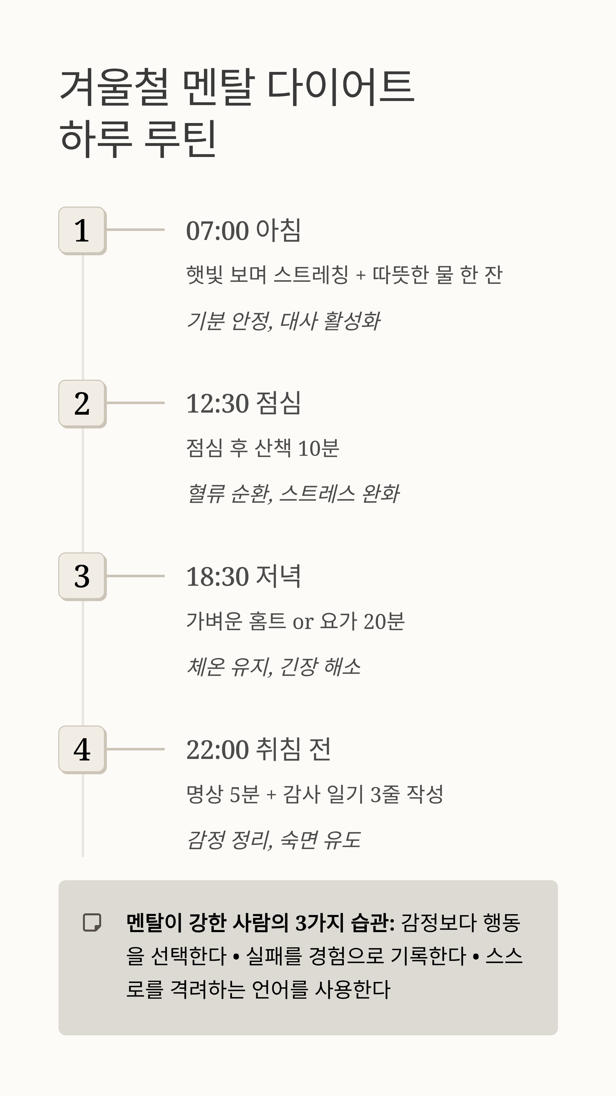 | 07:00 | 햇빛 보며 스트레칭 + 따뜻한 물 한 잔 | 기분 안정, 대사 활성화 |