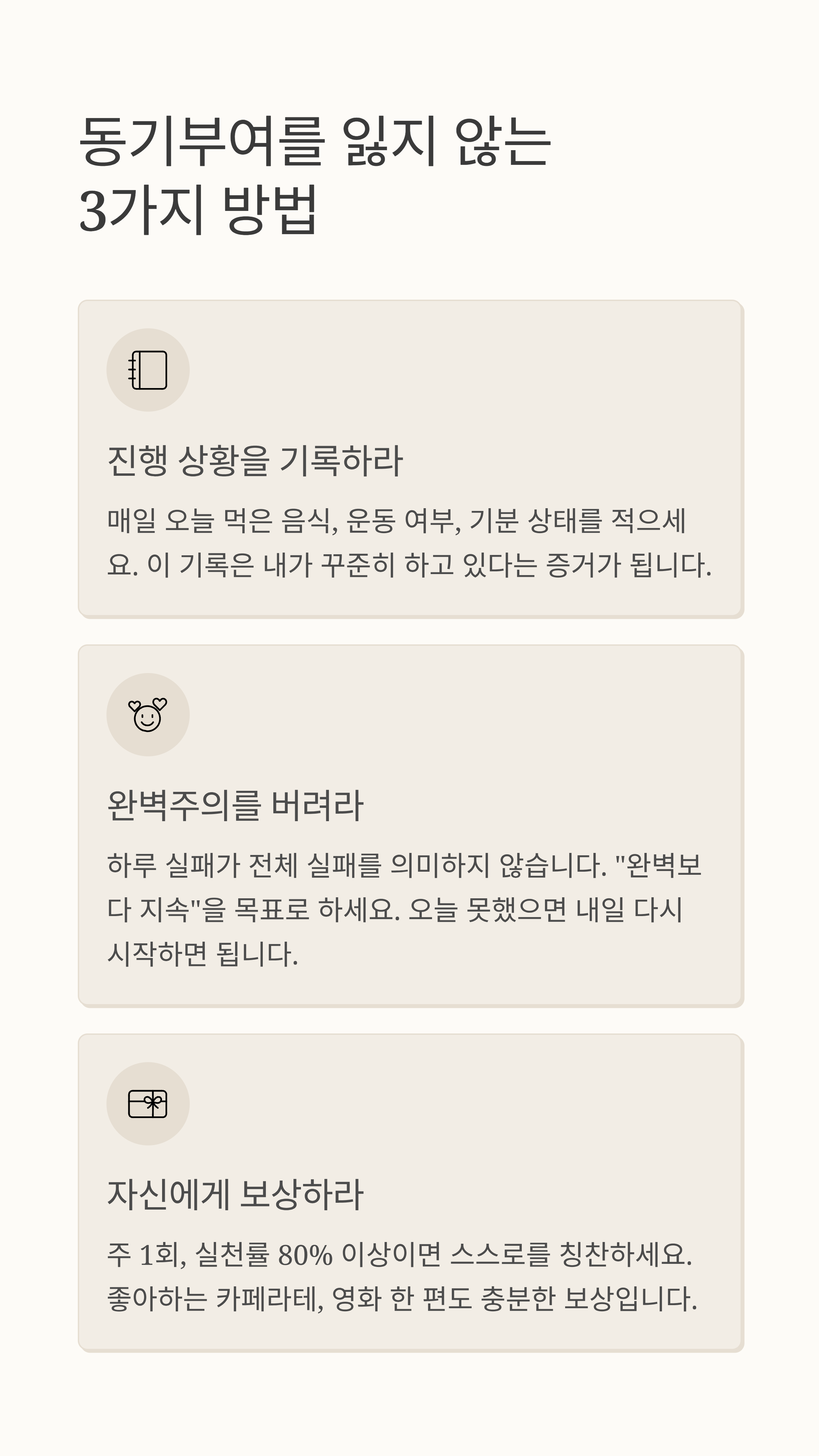 주 1회, 실천률 80% 이상이면 스스로를 칭찬하세요. 좋아하는 카페라테 한 잔, 영화 한 편, 따뜻한 목욕도 충분한 보상입니다. 이런 긍정적 보상은 ‘지속 동기’를 강화합니다.
