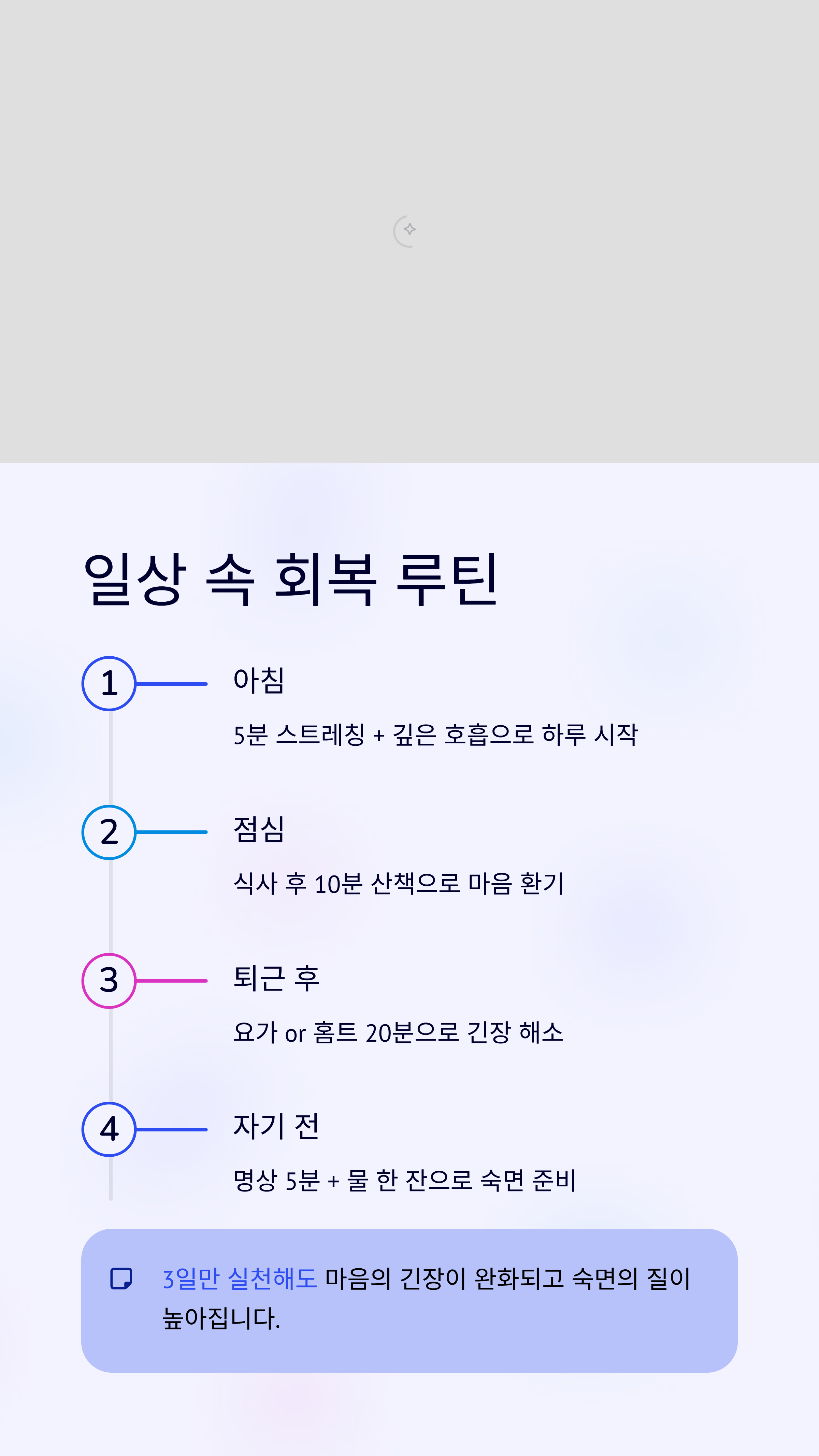 - 아침: 5분 스트레칭 + 깊은 호흡