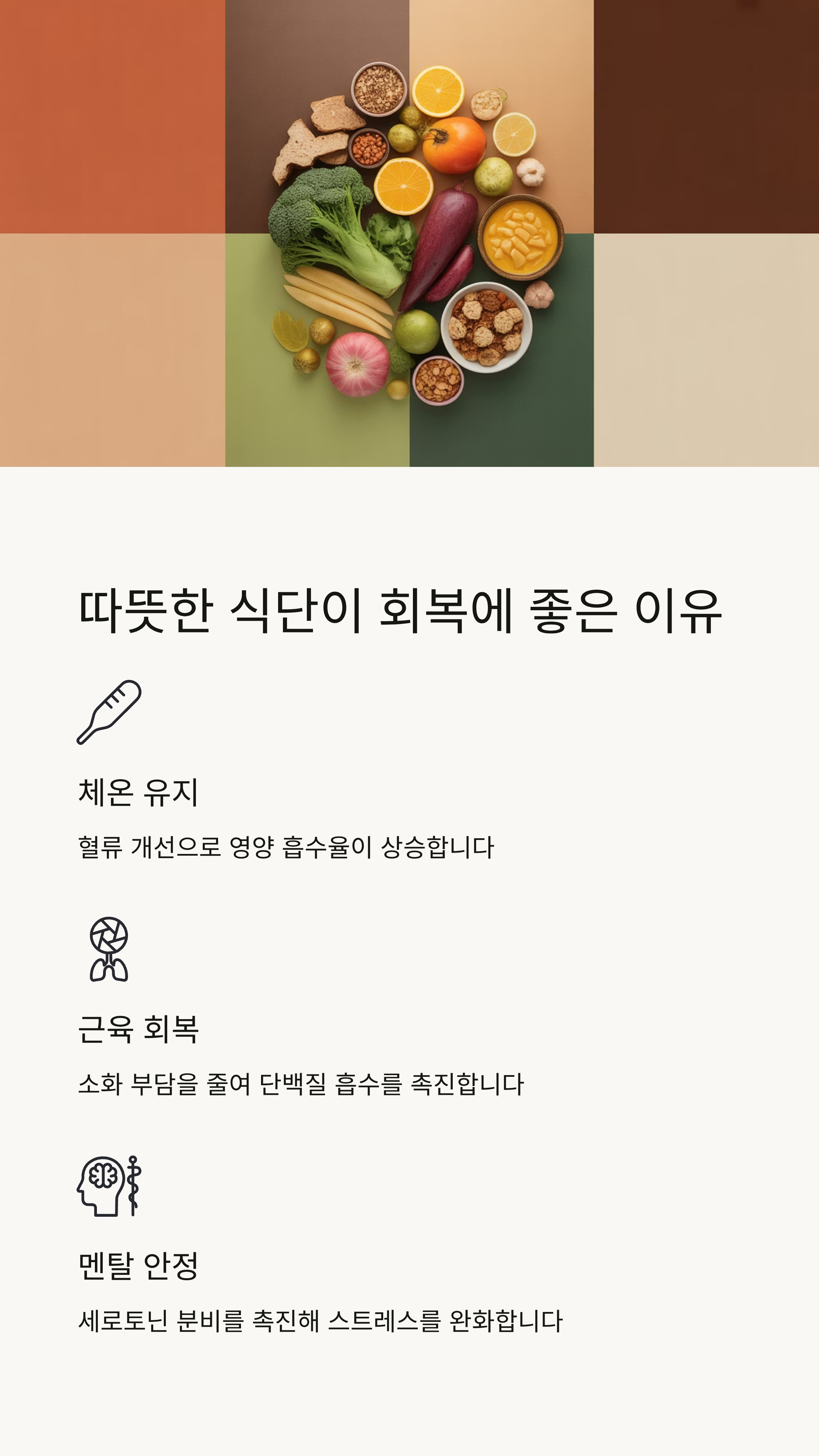 - 🧠 멘탈 안정: 따뜻한 음식은 세로토닌 분비를 촉진해 스트레스 완화