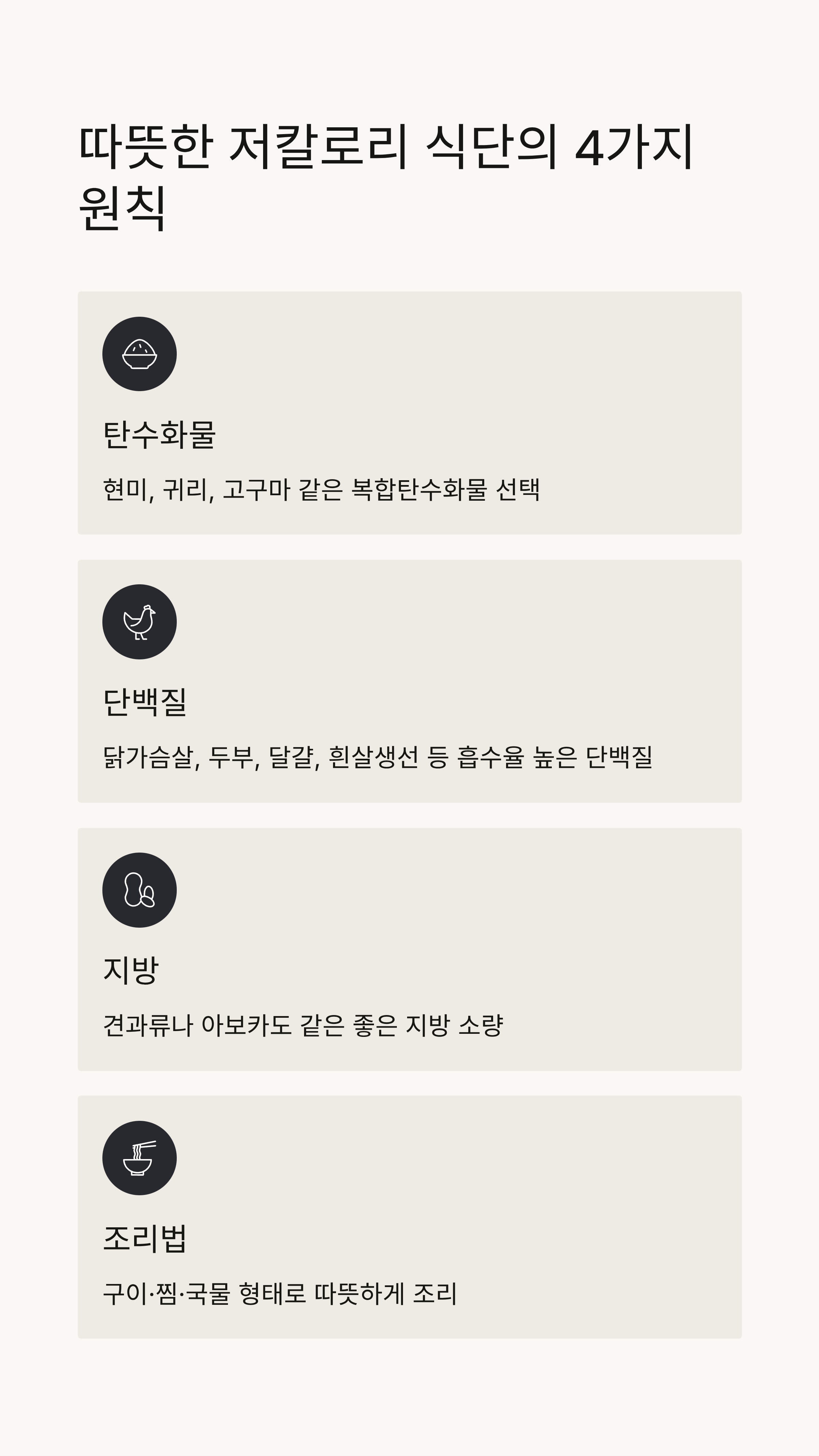 - ✅ 탄수화물: 현미, 귀리, 고구마처럼 복합탄수화물 선택