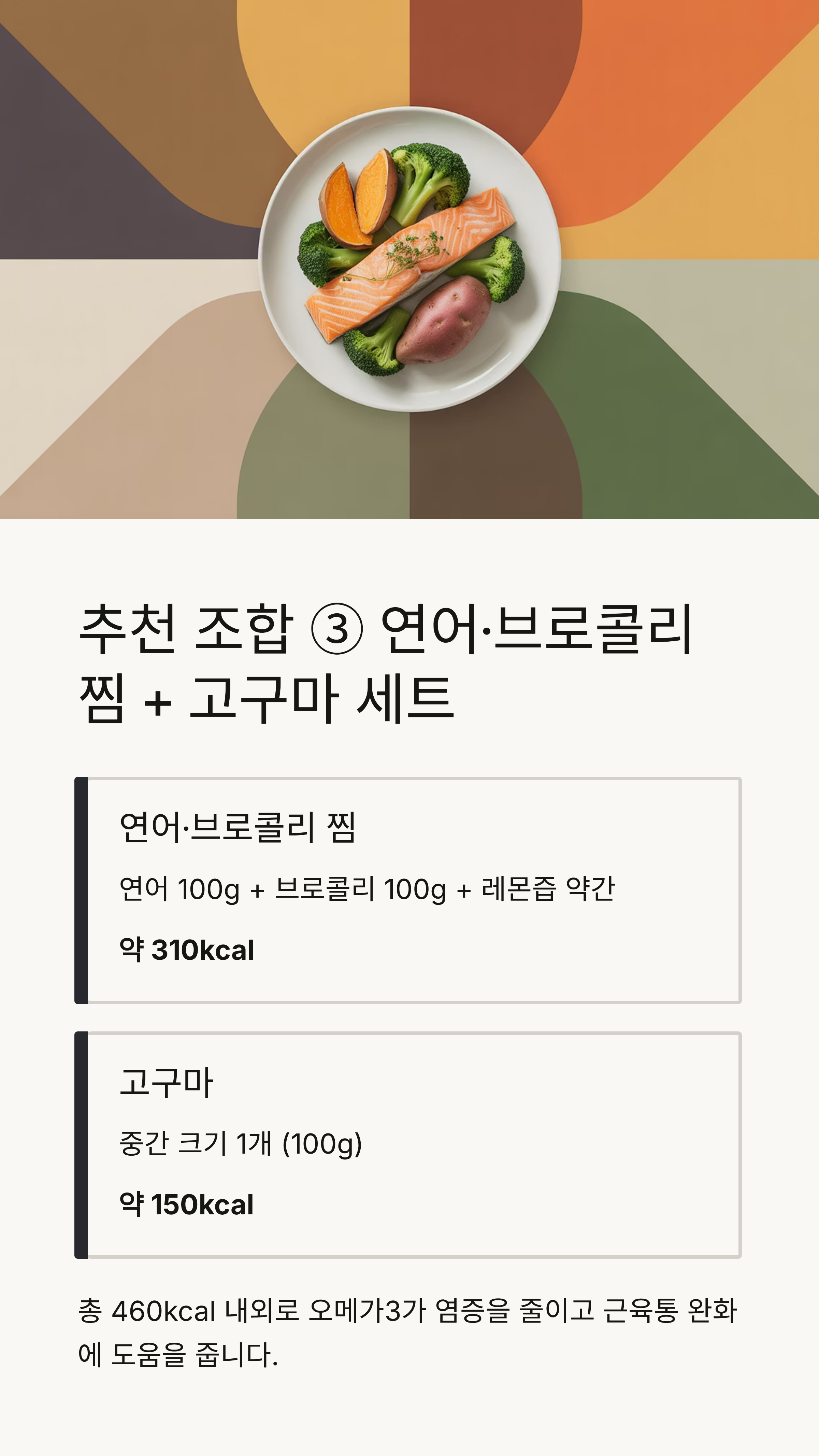 👉 총 460kcal 내외로 지방 연소 효율이 매우 높습니다. 연어의 오메가3 지방산은 염증을 줄이고 근육통 완화에 도움을 주며, 고구마의 천천히 흡수되는 탄수화물이 안정적인 에너지를 제공합니다.