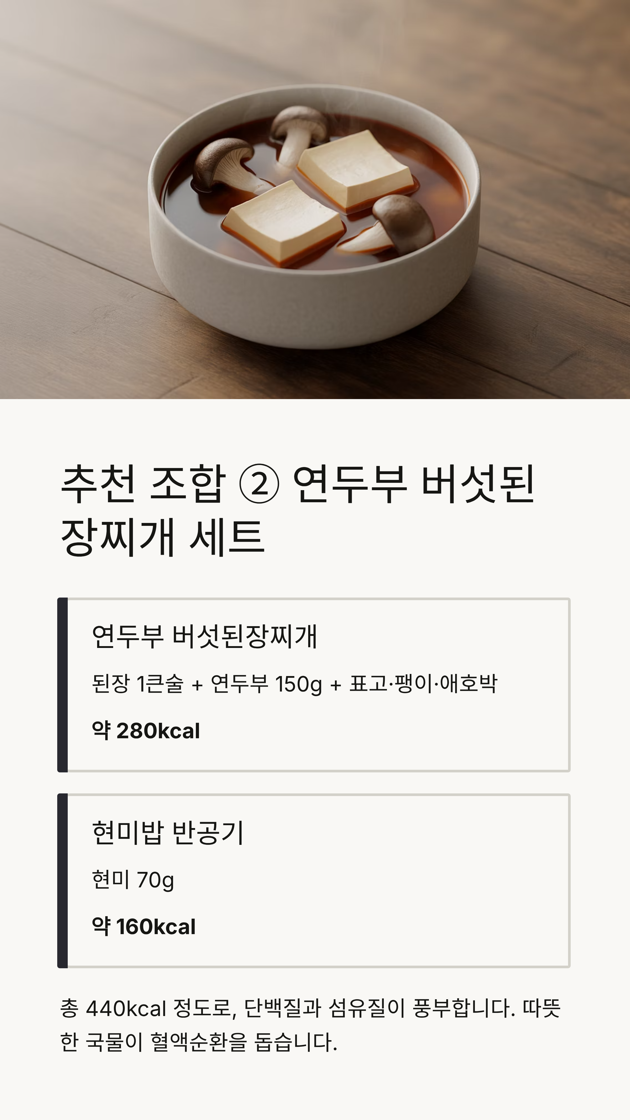 👉 총 440kcal 정도로, 단백질과 섬유질이 풍부합니다. 연두부의 식감은 포만감을 주면서도 소화가 잘되며, 따뜻한 국물이 혈액순환을 도와 지방 연소 이후 근육 회복에 좋습니다.