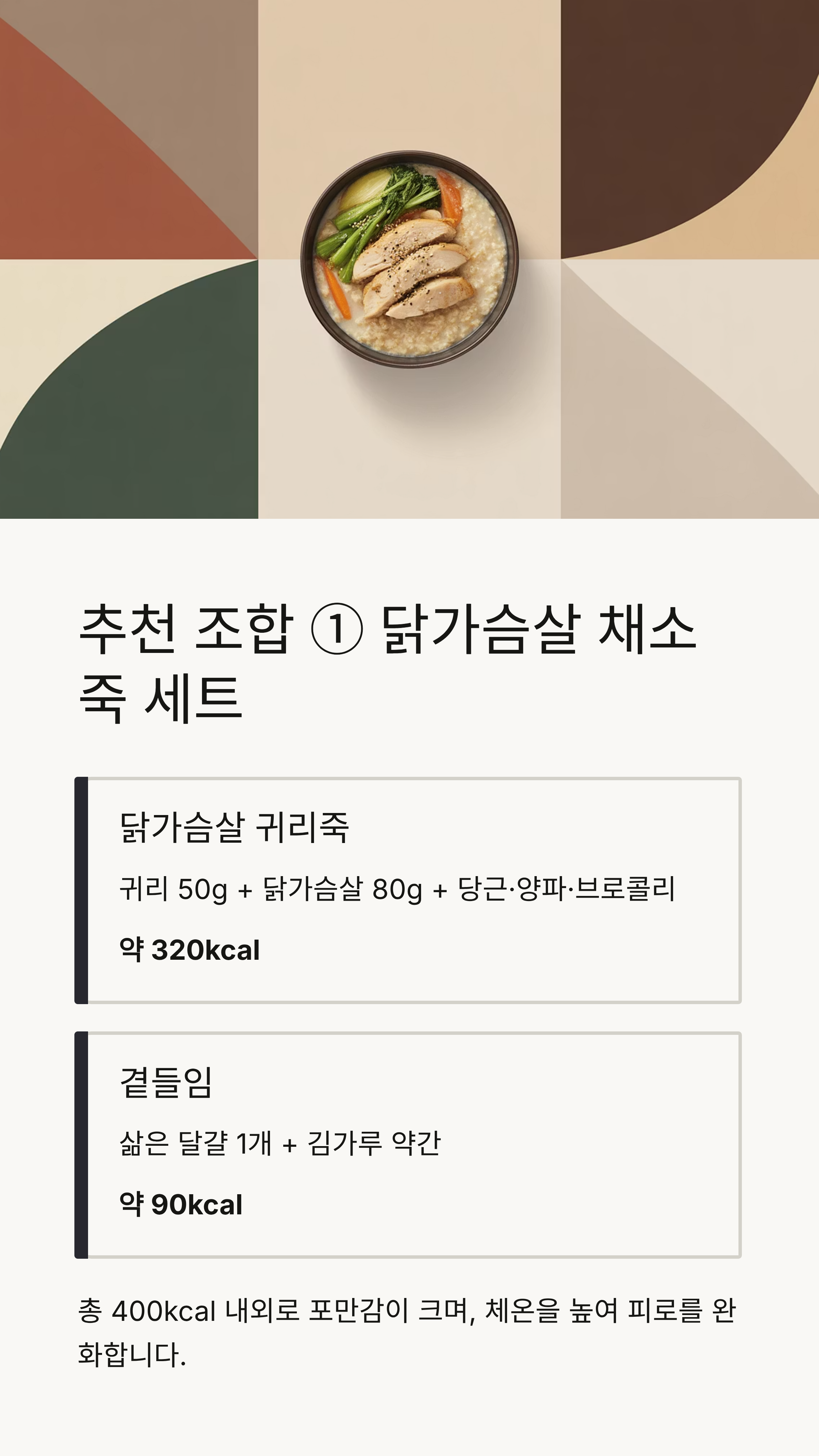 | 닭가슴살 귀리죽 | 귀리 50g + 닭가슴살 80g + 당근·양파·브로콜리 | 약 320kcal |