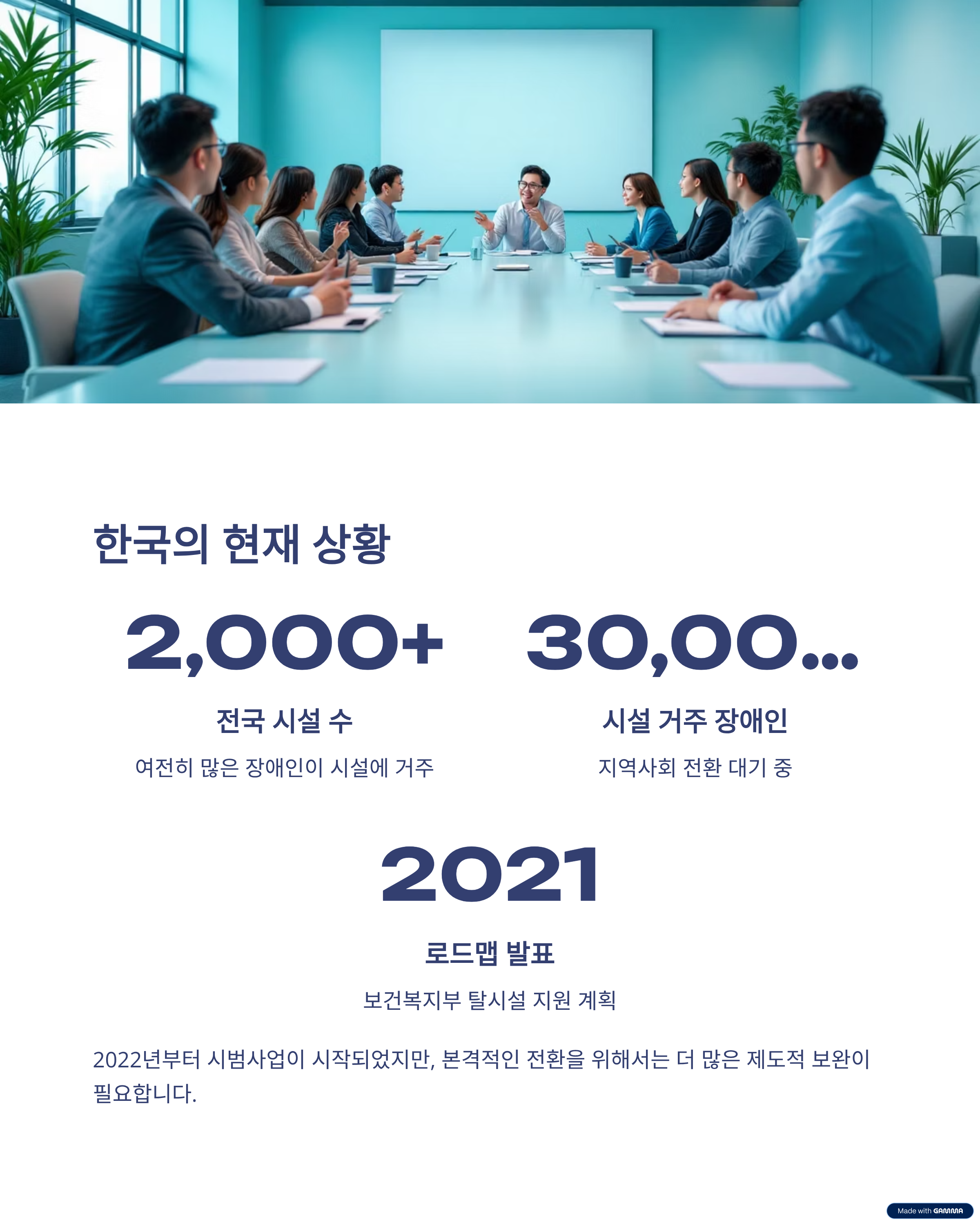 그러나 아직도 전국적으로 2,000여 개 시설에 3만 명 이상의 장애인이 거주하고 있어, 본격적인 전환을 위해서는 제도적 보완이 필요합니다.