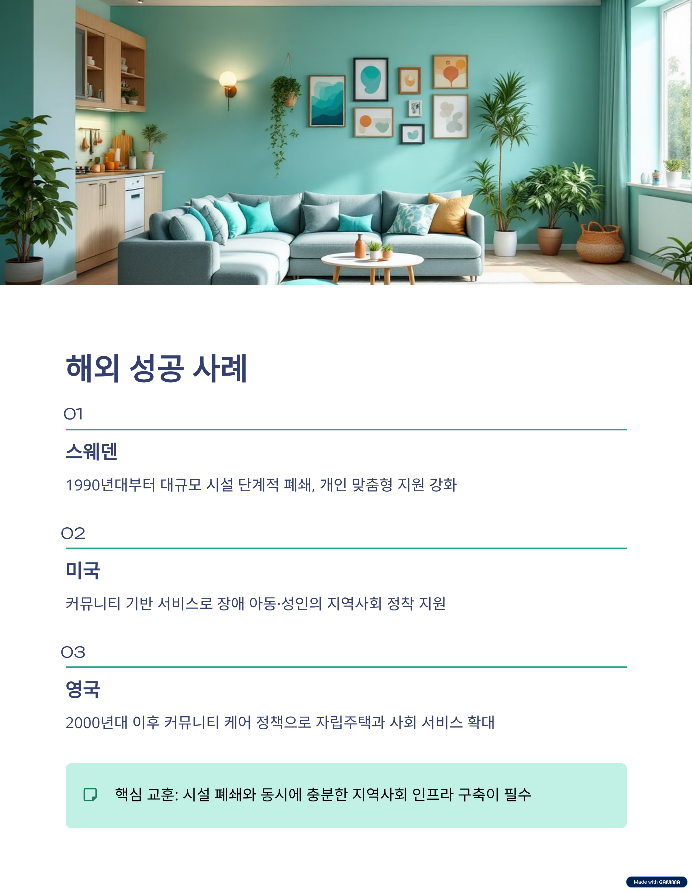 • 스웨덴: 1990년대 초반부터 대규모 시설을 단계적으로 폐쇄, 개인 맞춤형 지원 강화