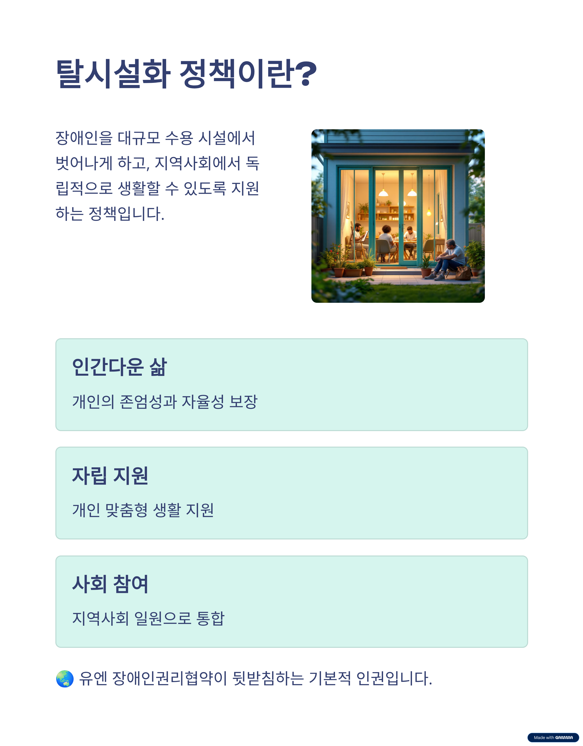 • 철학적 기반: 유엔 장애인권리협약(UN CRPD) – “장애인은 지역사회에서 동등하게 살아갈 권리가 있다.”
