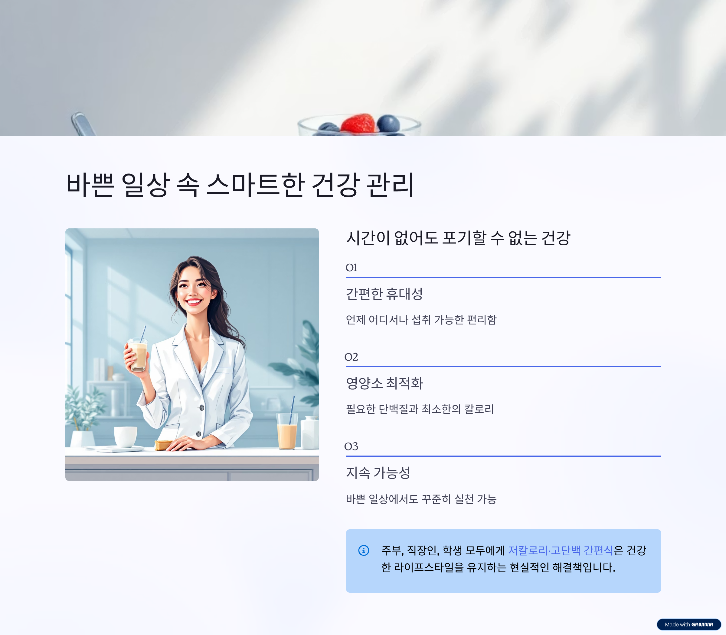 저칼로리·고단백 간편식은 단순한 유행이 아닙니다. 현대인의 건강한 라이프스타일을 위한 필수 요소로 자리 잡고 있습니다. 다이어트, 운동, 직장 생활, 가정 관리까지 모두 연결된 해답이 바로 이 간편식입니다. 오늘 저녁부터라도, 냉장고에 고단백 간편식 몇 가지를 준비해 보세요. 당신의 건강과 라이프스타일이 달라질 것입니다.