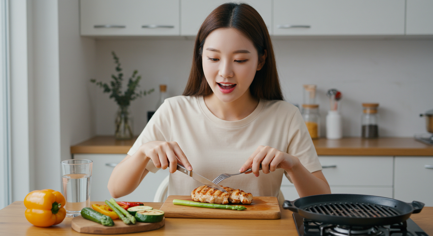 - 닭가슴살 스테이크 + 구운 채소 → 고단백 + 포만감