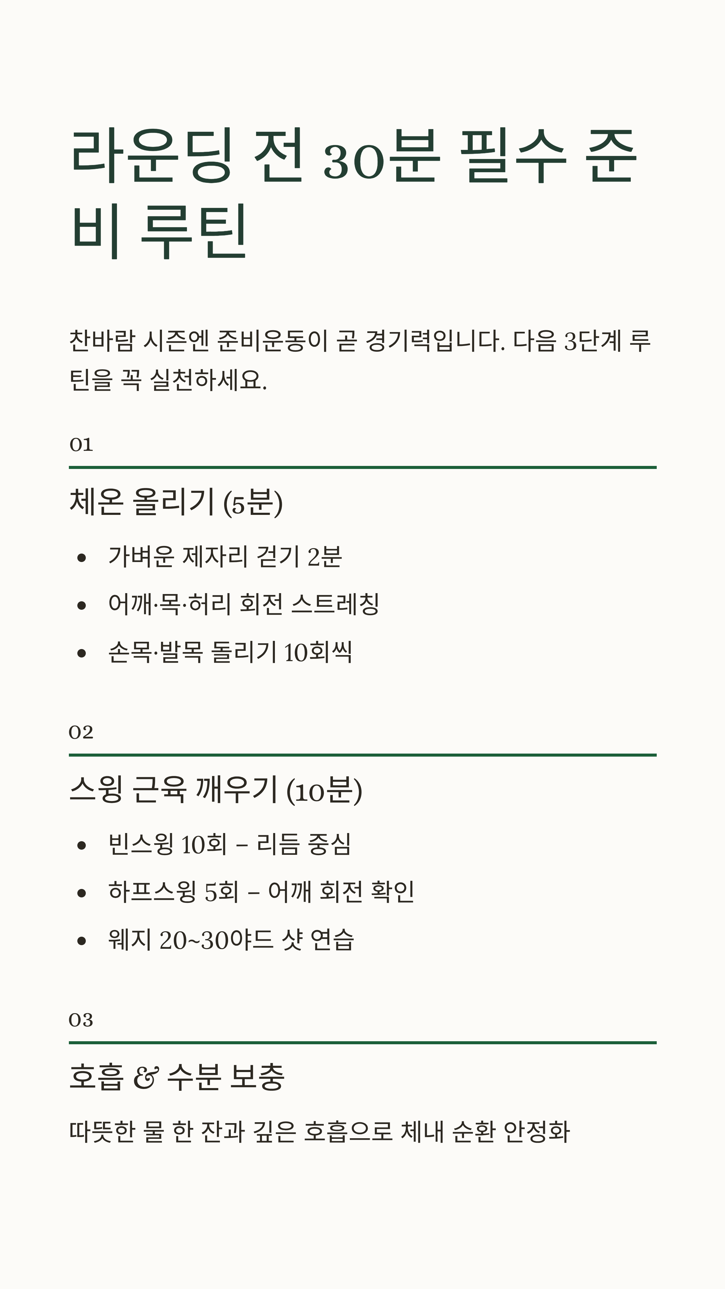찬바람이 부는 시즌엔 “준비운동이 곧 경기력”입니다. 라운딩 시작 30분 전, 다음 루틴을 꼭 실천해보세요.