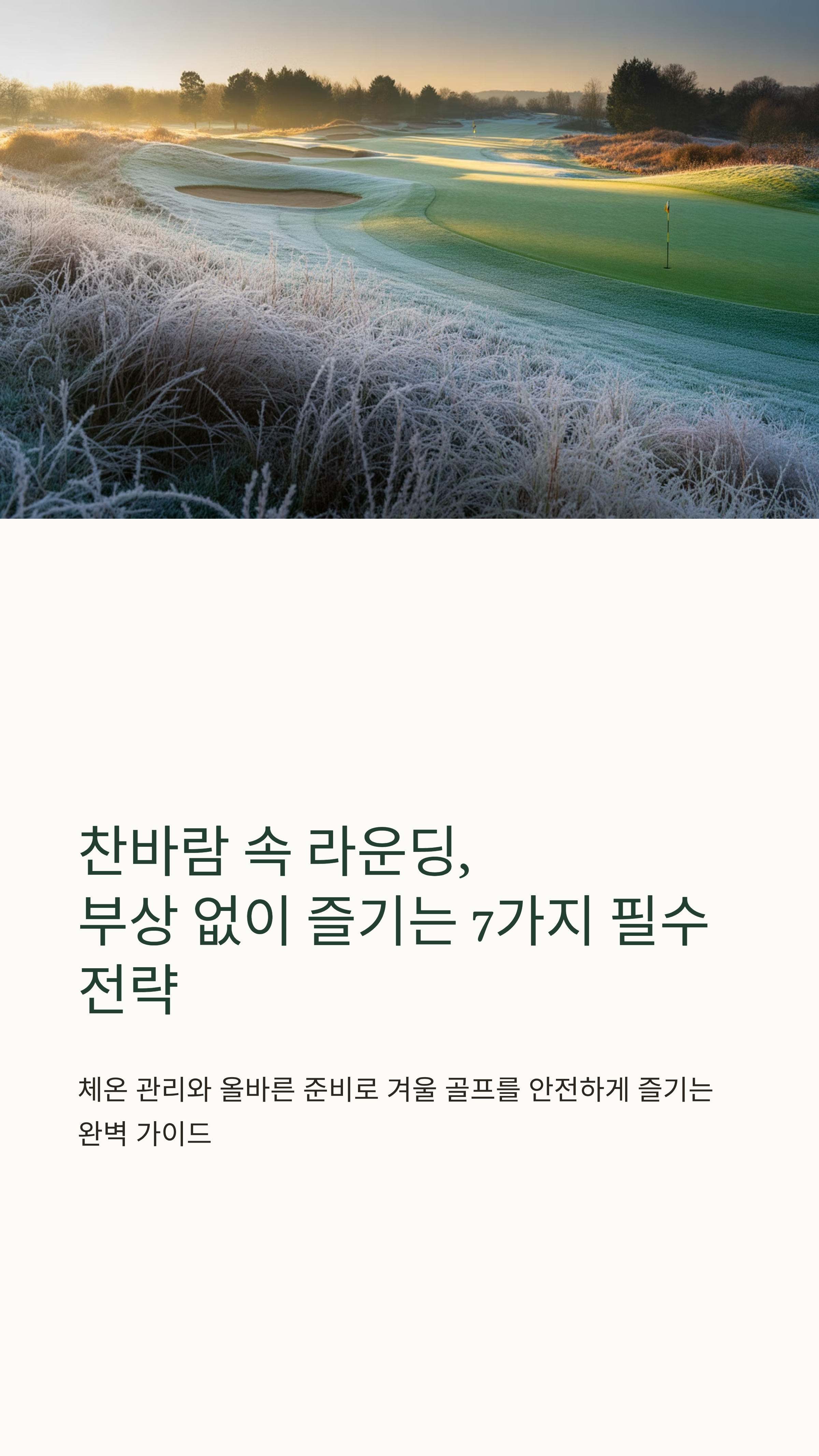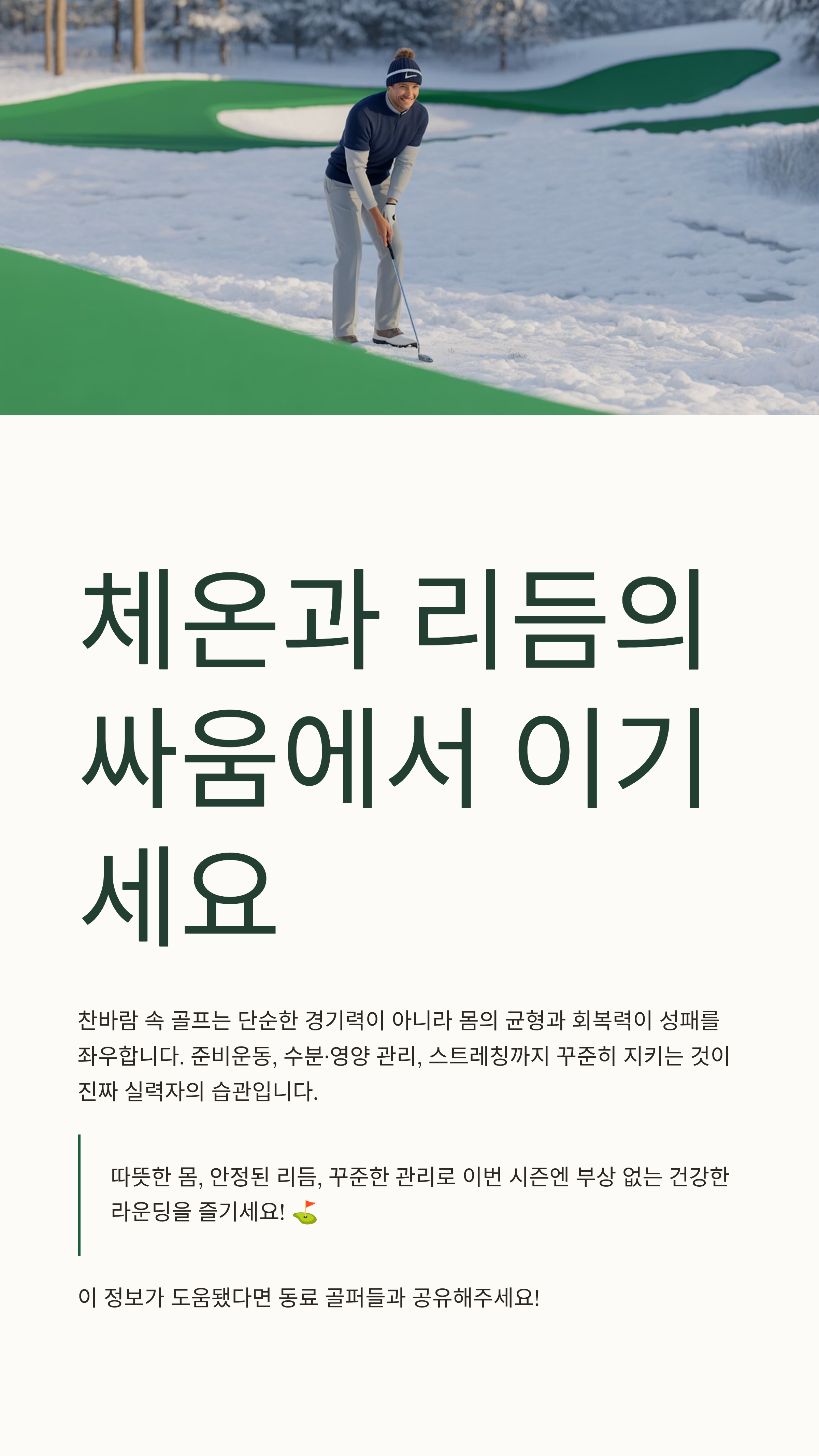 찬바람이 불 때의 골프는 단순한 경기력이 아니라 몸의 균형과 회복력이 성패를 좌우합니다. 준비운동, 수분·영양 관리, 라운드 후 스트레칭까지 꾸준히 지켜주는 것이야말로 진짜 실력자의 습관입니다. 따뜻한 몸, 안정된 리듬, 꾸준한 관리로 이번 시즌엔 부상 없는 건강한 라운딩을 즐기세요.