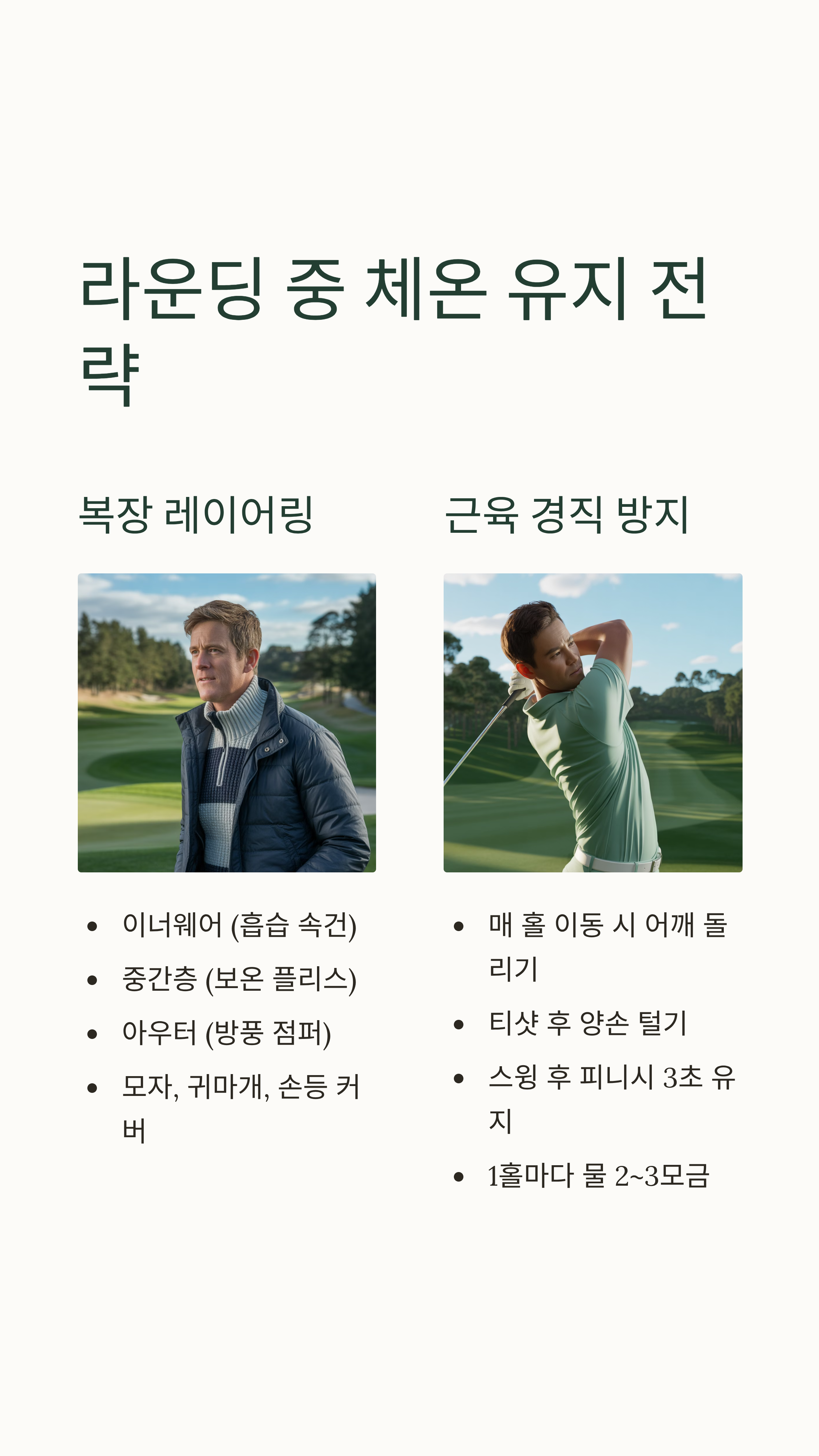 라운딩 중엔 체온이 떨어지지 않도록 복장과 리듬 관리가 중요합니다.