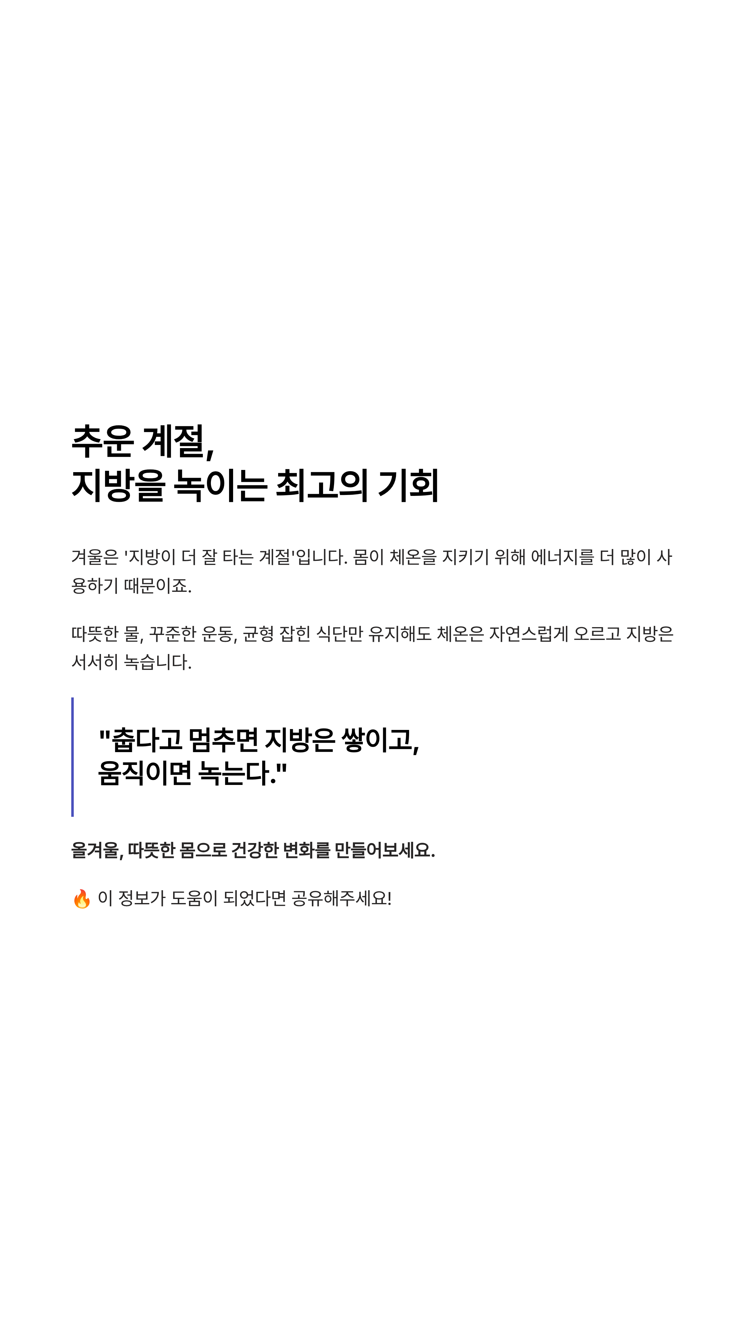 👉 추운 날엔 강도보다 ‘지속성’이 중요합니다. 체온을 유지하며 꾸준히 움직이는 것이 지방 연소의 핵심입니다.