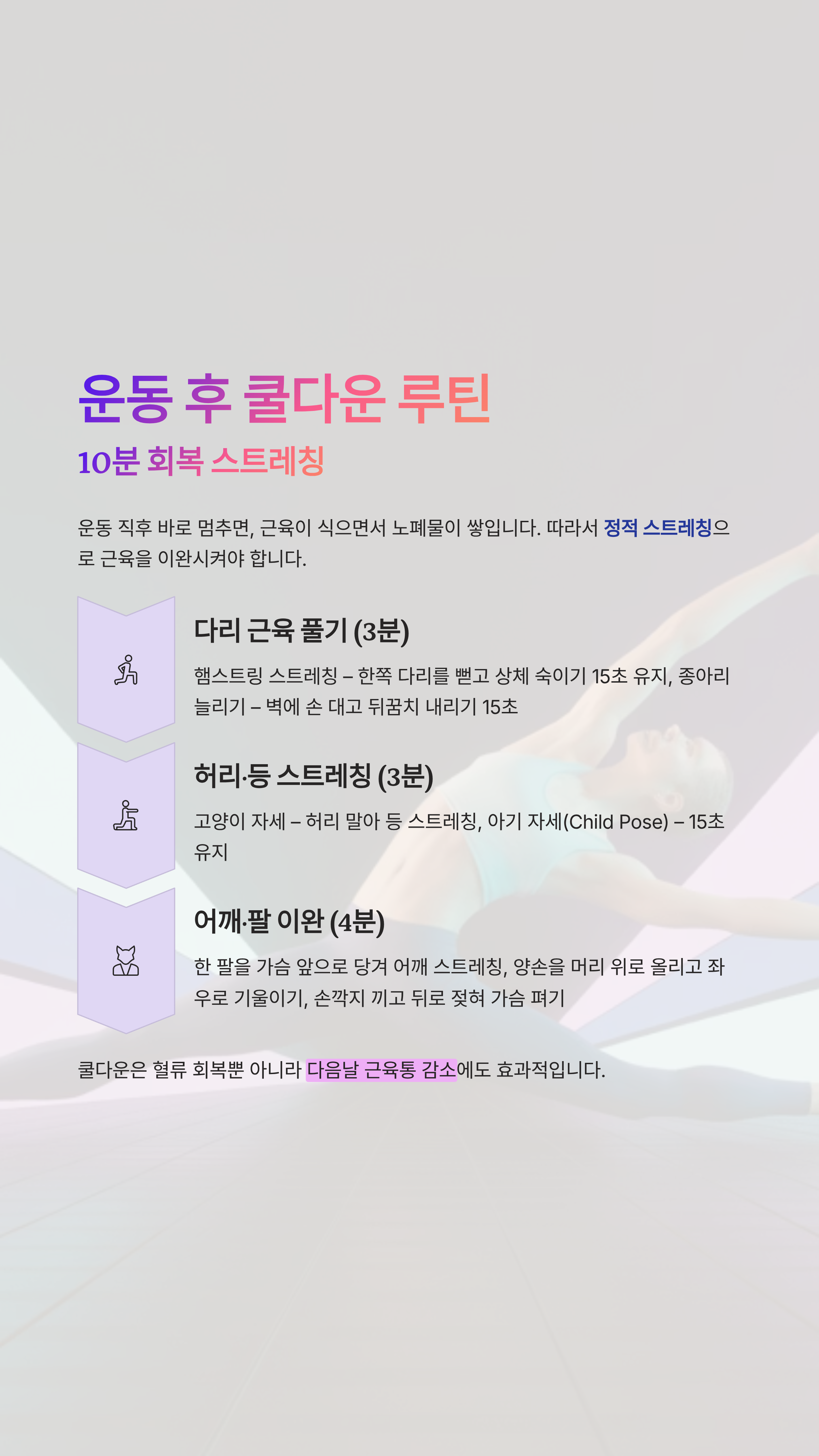 👉 쿨다운은 혈류 회복뿐 아니라 다음날 근육통 감소에도 효과적입니다.