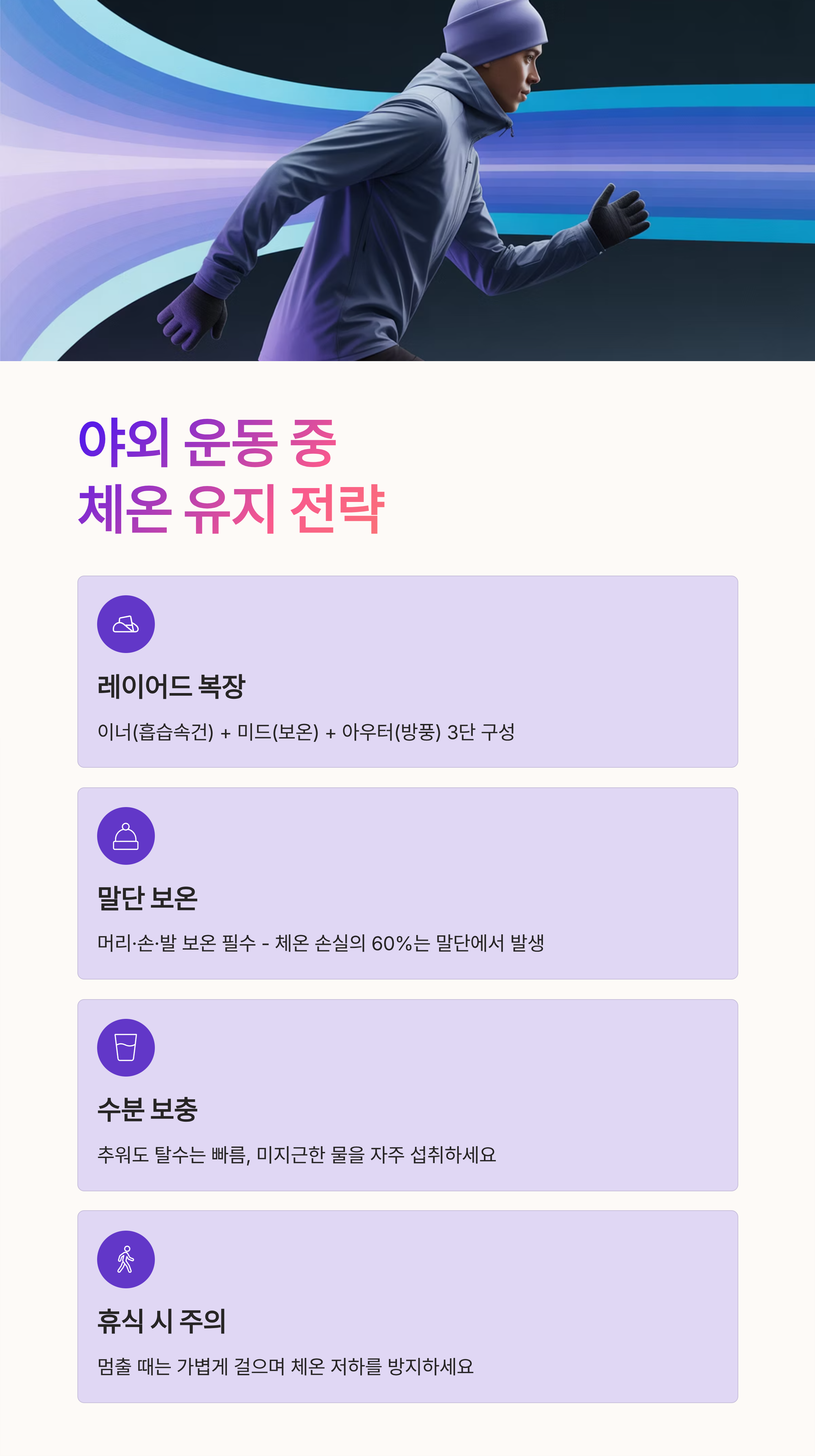 오늘은 추운 날씨에도 안전하게 운동할 수 있는 스트레칭 루틴과 체온 관리법을 소개합니다.