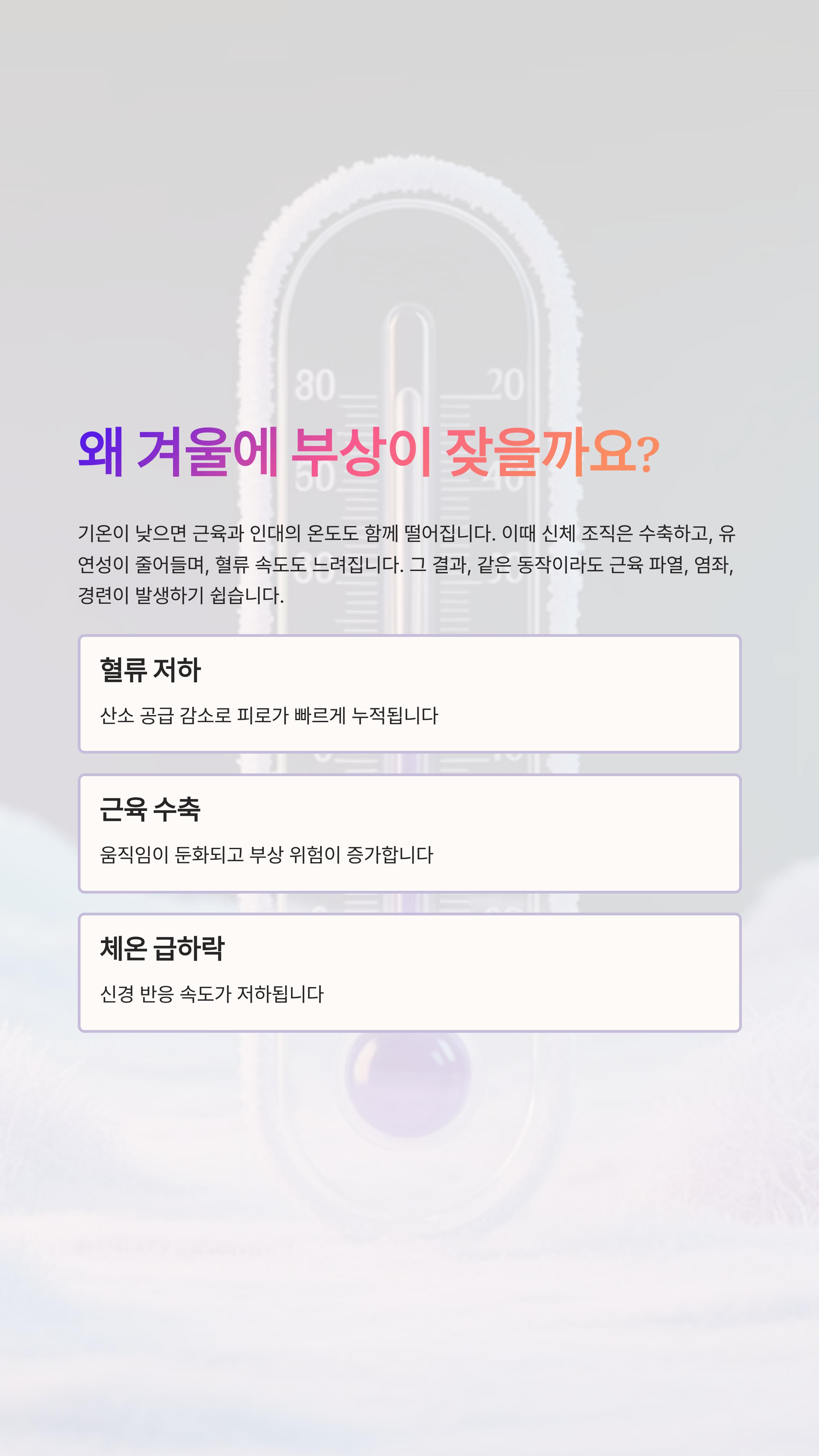기온이 낮으면 근육과 인대의 온도도 함께 떨어집니다. 이때 신체 조직은 수축하고, 유연성이 줄어들며, 혈류 속도도 느려집니다. 그 결과, 같은 동작이라도 근육 파열·염좌·경련이 발생하기 쉽습니다.